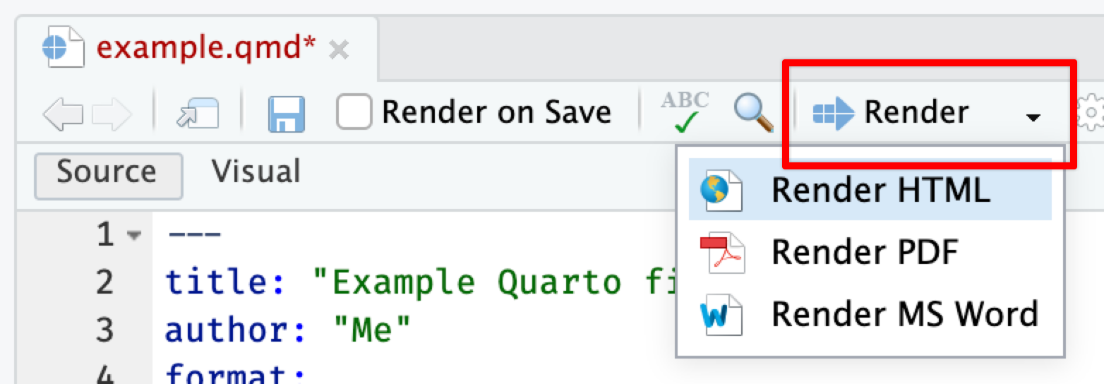 When you’re all done, click on the “Render” button at the top of the editing window and create a Typst (pdf), PDF, or Word version of your document. Upload that file to iCollege. Do not upload a rendered HTML file (they don’t work on iCollege).