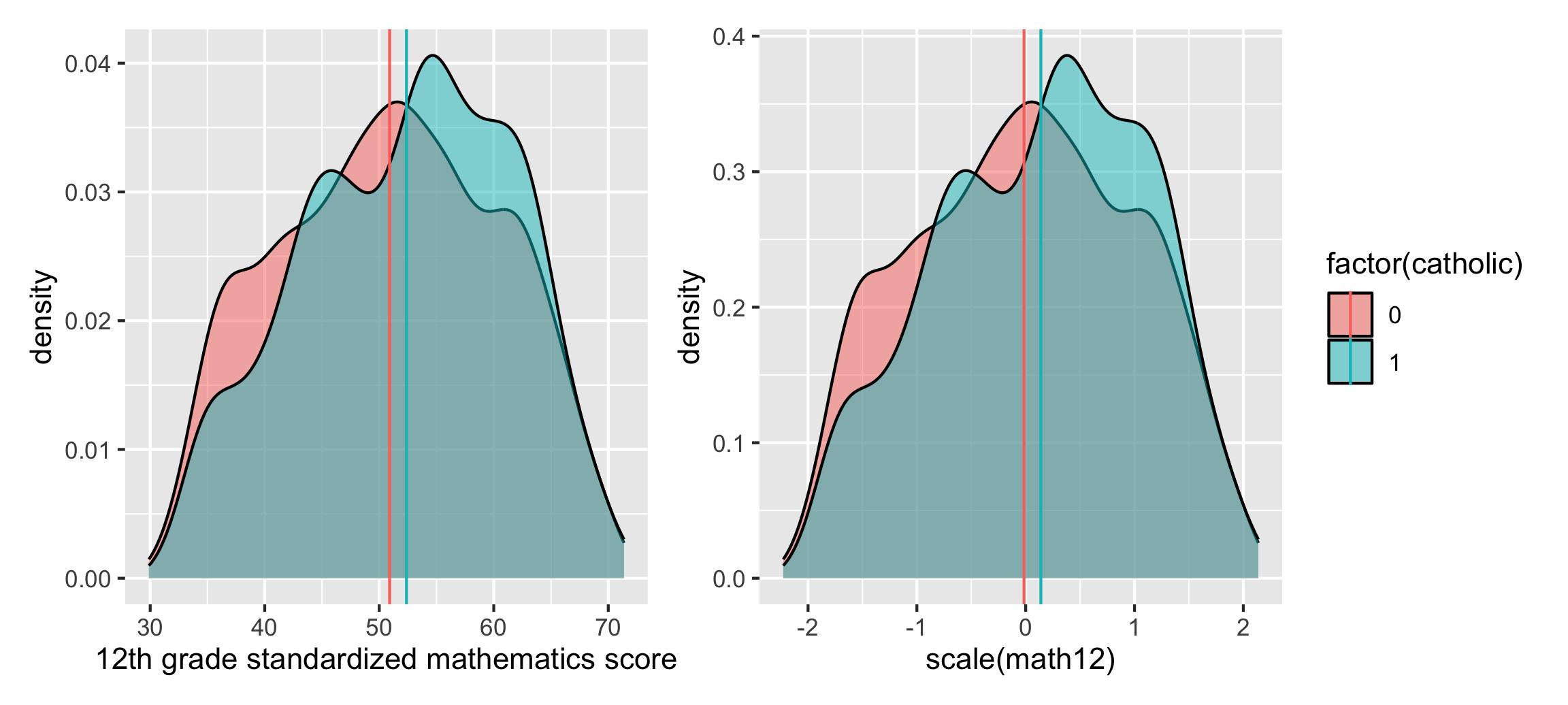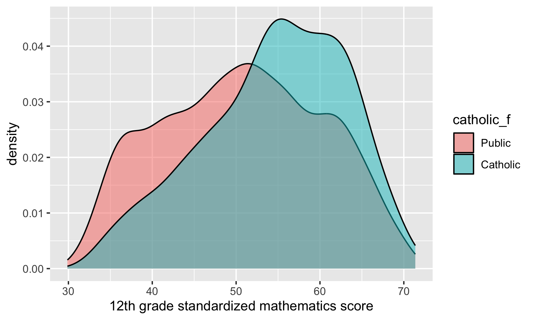 Our main question here is whether attending a Catholic high school (instead of a public high school) causes people to have higher math scores in 12th grade. The data contains a sample of 5,671 students from the [National Education Longitudinal Study of 1988](https://nces.ed.gov/surveys/nels88/) (NELS:88)—these students lived in households with annual income of less than $75,000 (1988 dollars) in the first year of the NELS:88 survey. A clean version of the dataset is available at [UCLA's IDRE statistical consulting website](https://stats.idre.ucla.edu/stata/examples/methods-matter/chapter12/), but only as a Stata file. I loaded this data using Stata, then saved it from Stata and [included it here](/files/data/external_data/catholic.dta) on this website. (You can see another example of this data being [used for propensity score matching here](https://bookdown.org/aschmi11/causal_inf/propensity-score-matching.html).)