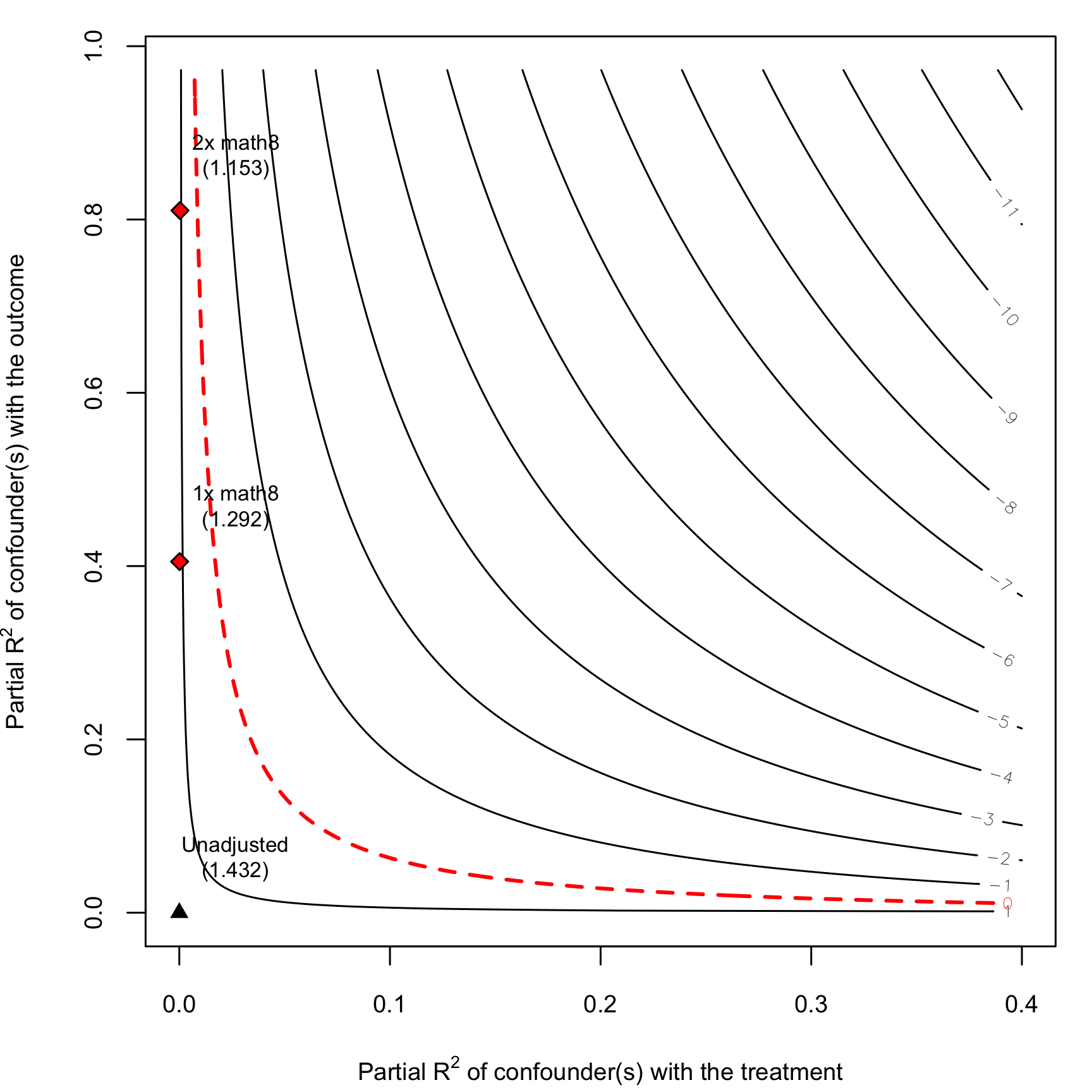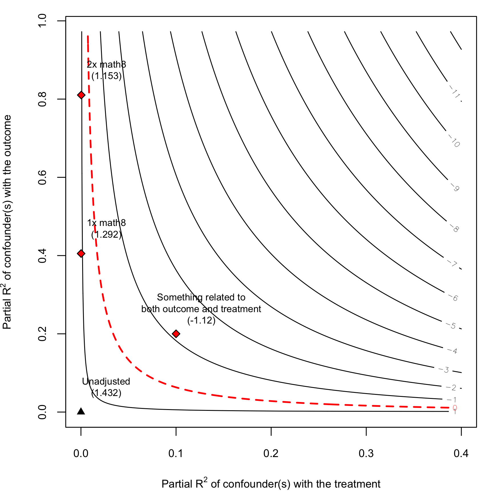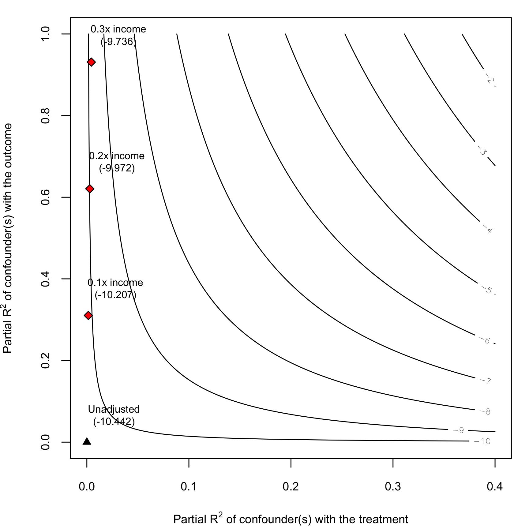 Each contour in the plot shows a value of the ATE. The black triangle shows the current ATE (rounded to -11 here), and the red diamonds show what the ATE would be if a confounder a tenth as strong as income, 20% the strength of income, and 30% the strength of income was included. Adding something like this wouldn't really change the results much at all—all the diamonds are still below the -10 ATE, and none of them really push the results towards 0. In fact, an ATE = 0 curve doesn't even appear on the plot—the lowest ATE we could possibly get if is -3, and that's only if there's a hypothetical confounder that explains almost 100% of the variation in outcome and 40% of the variation in treatment.