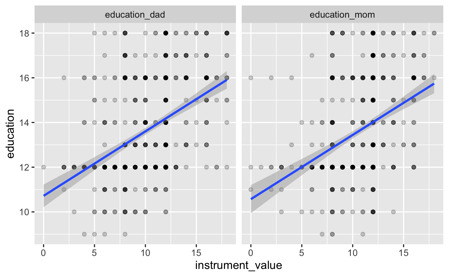 We can first test relevance by making a scatterplot and running a model of `policy ~ instrument`: