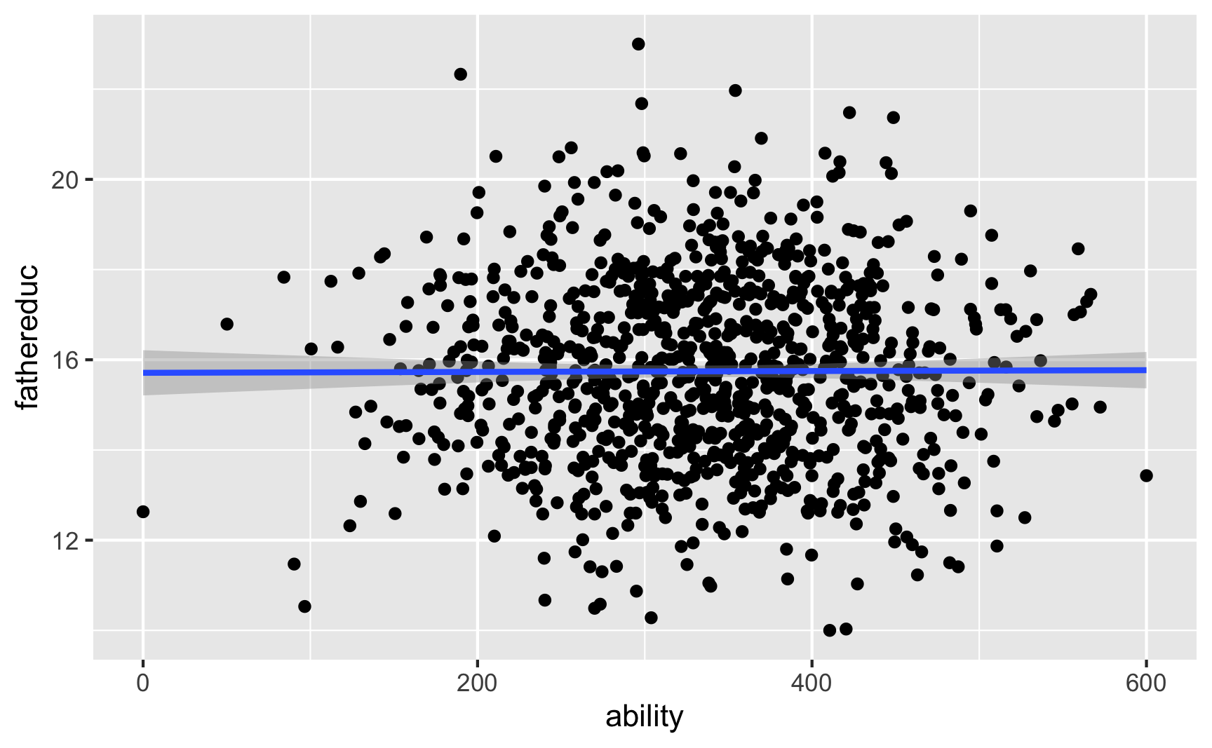 There's not really a test for exogeneity either, since there's no way to measure other endogenous variables in the model (that's the whole reason we're using IVs in the first place!). Because we have the magical `ability` column in this fake data, we can test it. Father's education shouldn't be related to ability: