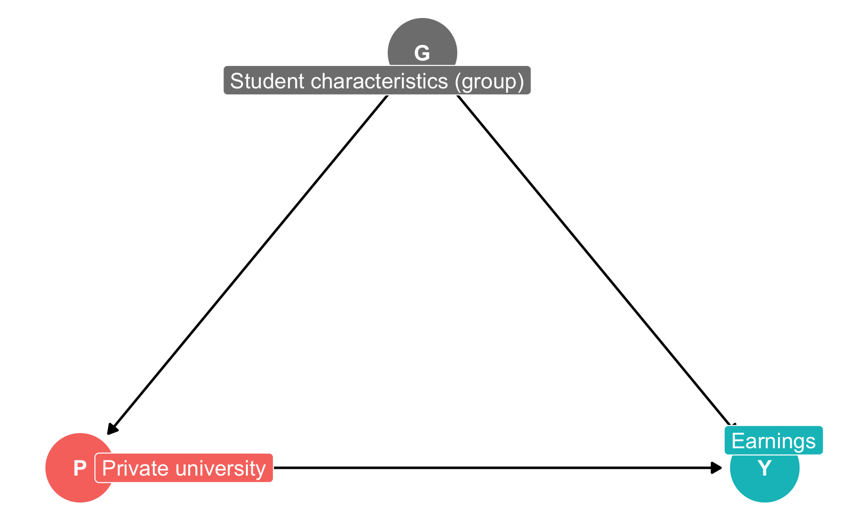dag <-dagify(Y ~ P + G, P ~ G,exposure ="P",outcome ="Y",labels =c(Y ="Earnings", P ="Private university",G ="Student characteristics (group)"),coords =list(x =c(Y =3, P =1, G =2),y =c(Y =1, P =1, G =2)))ggdag_status(dag, use_labels ="label") +guides(color ="none") +# Remove legendtheme_dag()