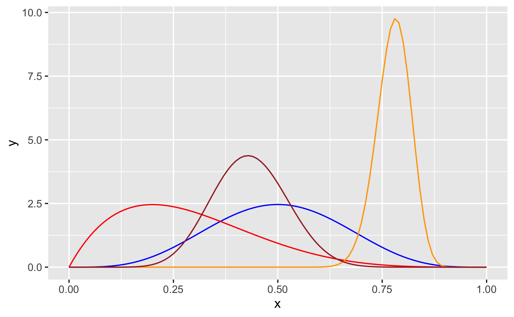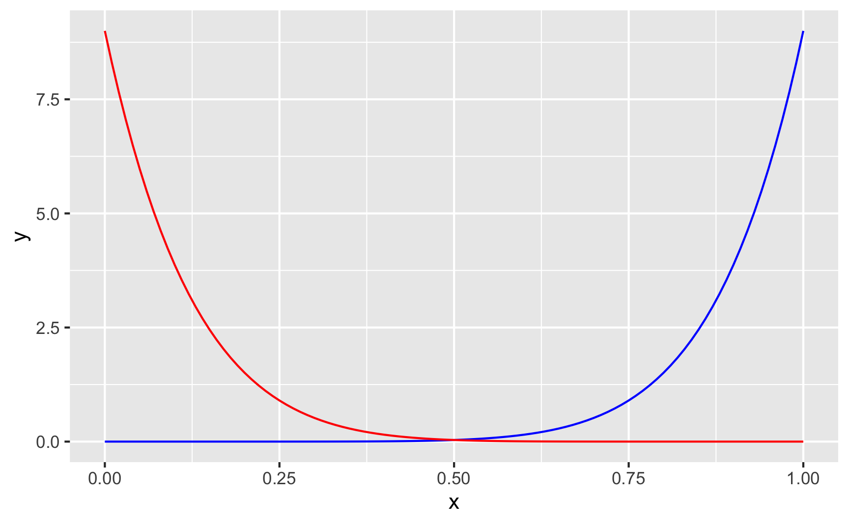 geom_function(fun = ~dbeta(.x, shape1 = 9, shape2 = 1), color = "blue") +