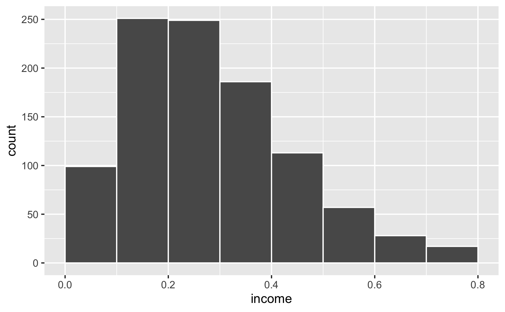 fake_people <- tibble(income = rbeta(1000, shape1 = 2, shape2 = 5))
