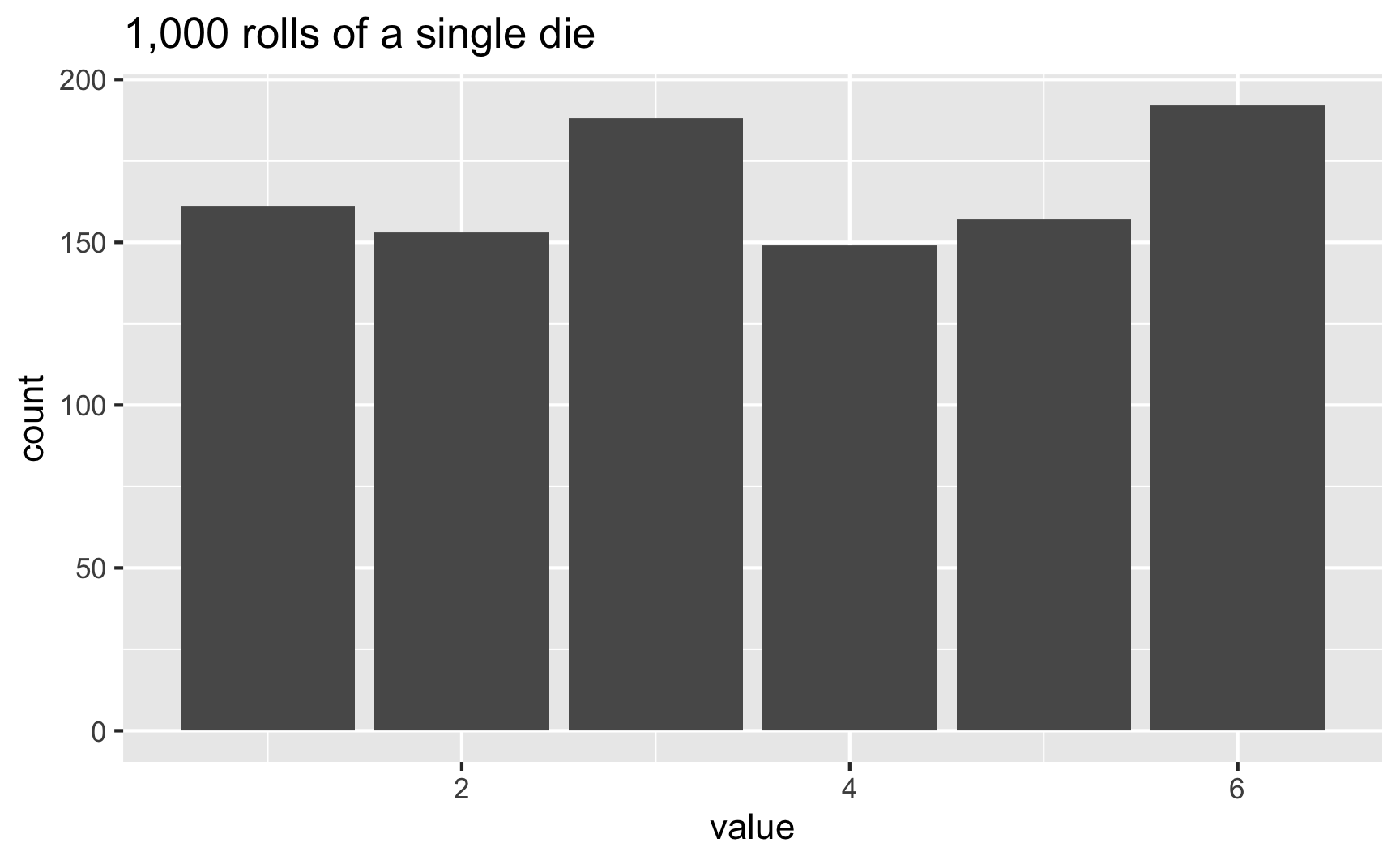 It’s hard to see patterns in the outcomes when generating just a handful of numbers, but easier when you do a lot. Let’s roll a die 1,000 times: