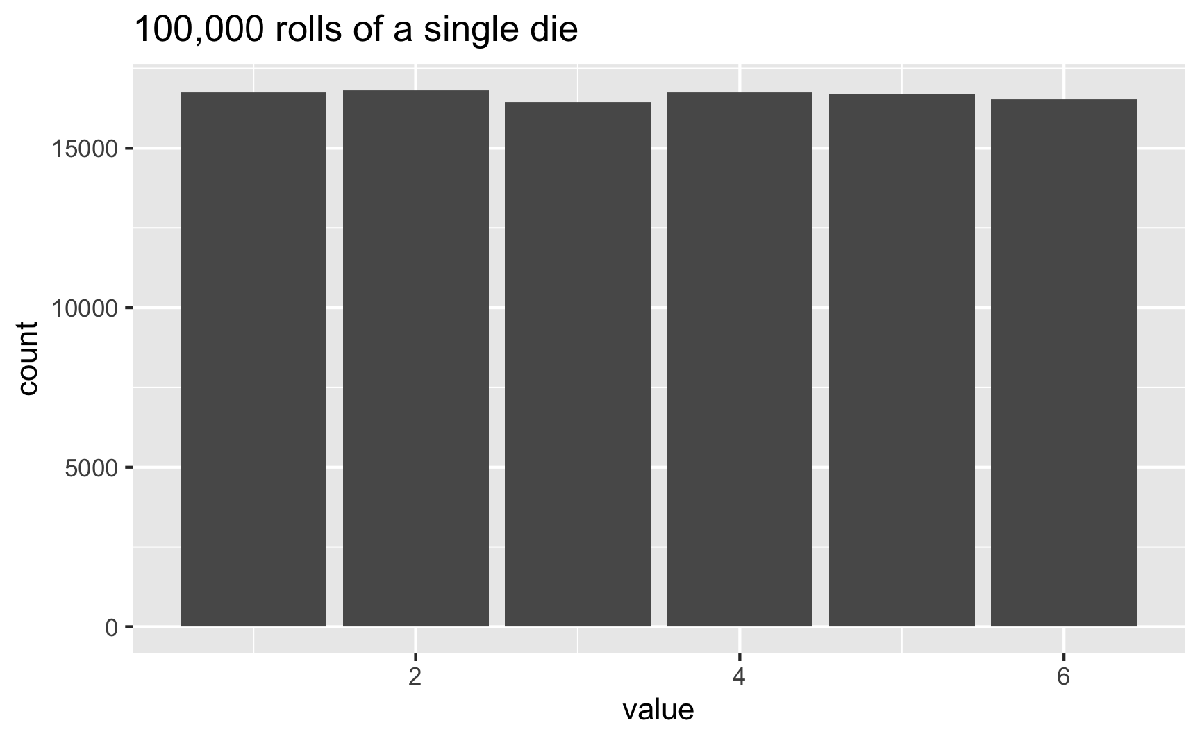 In this case, 3 and 6 came up more often than the others, but that’s just because of randomness. If we rolled the die 100,000 times, the bars should basically be the same: