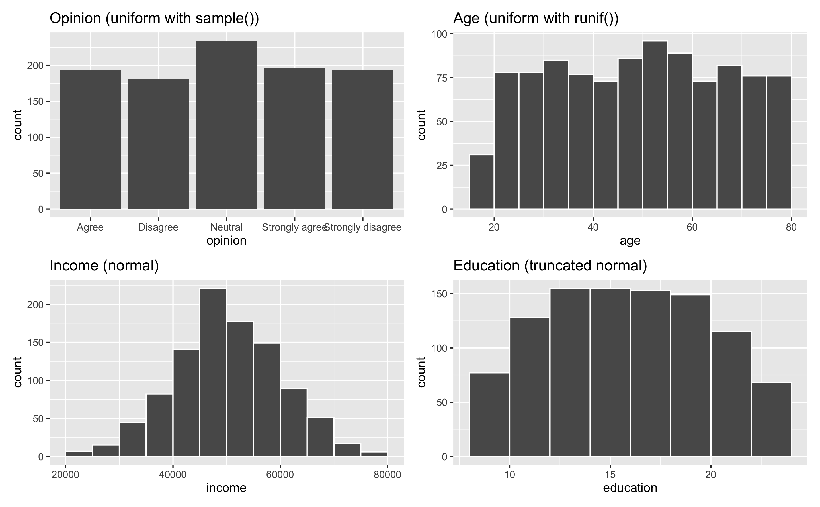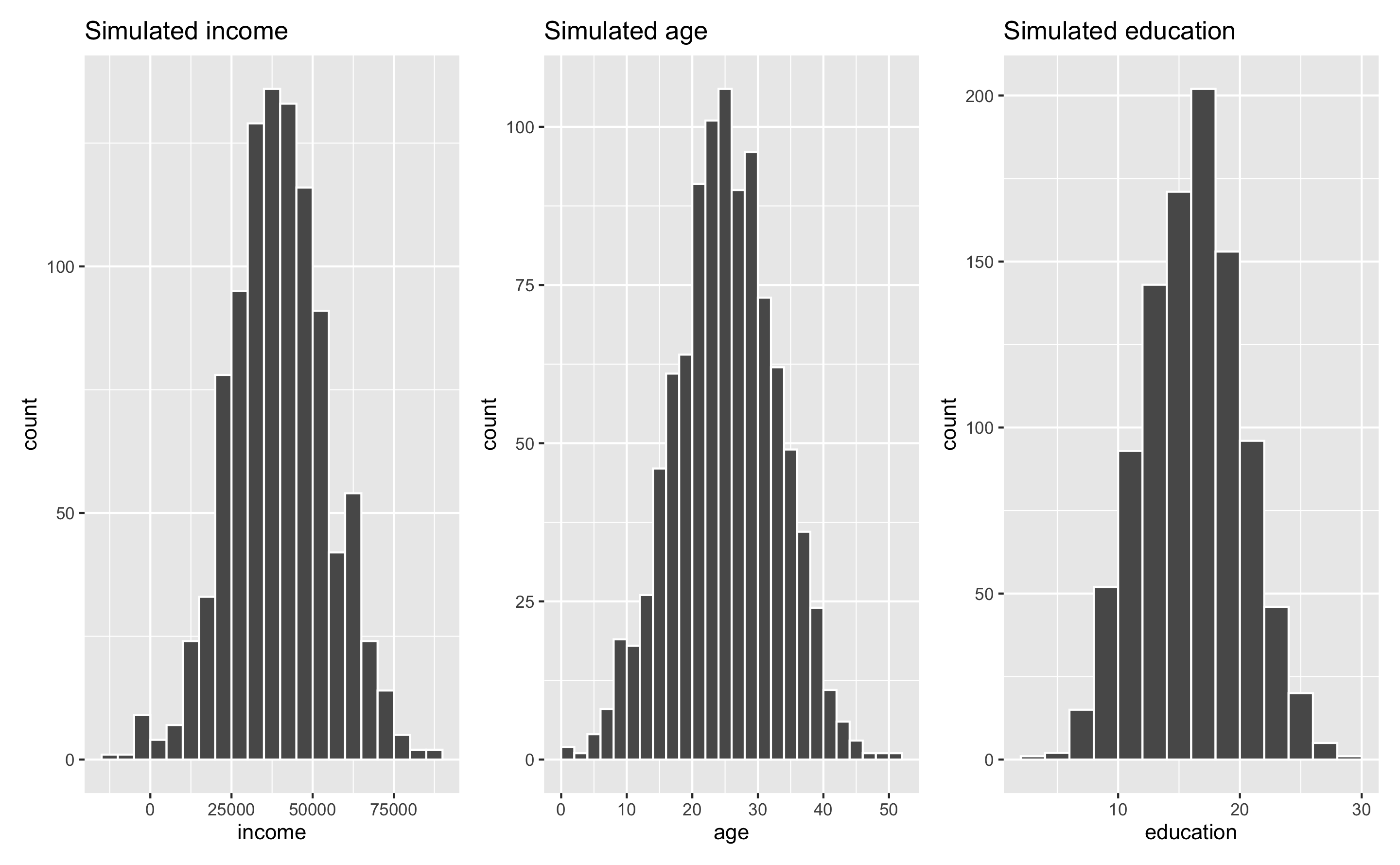 When simulating data, you’ll most often use a normal distribution just because it’s easy and lots of things follow that pattern in the real world. Incomes, ages, education, etc. all have a kind of gravity to them, and a normal distribution is a good way of showing that gravity. For instance, here are 1,000 simulated people with reasonable random incomes, ages, and years of education: