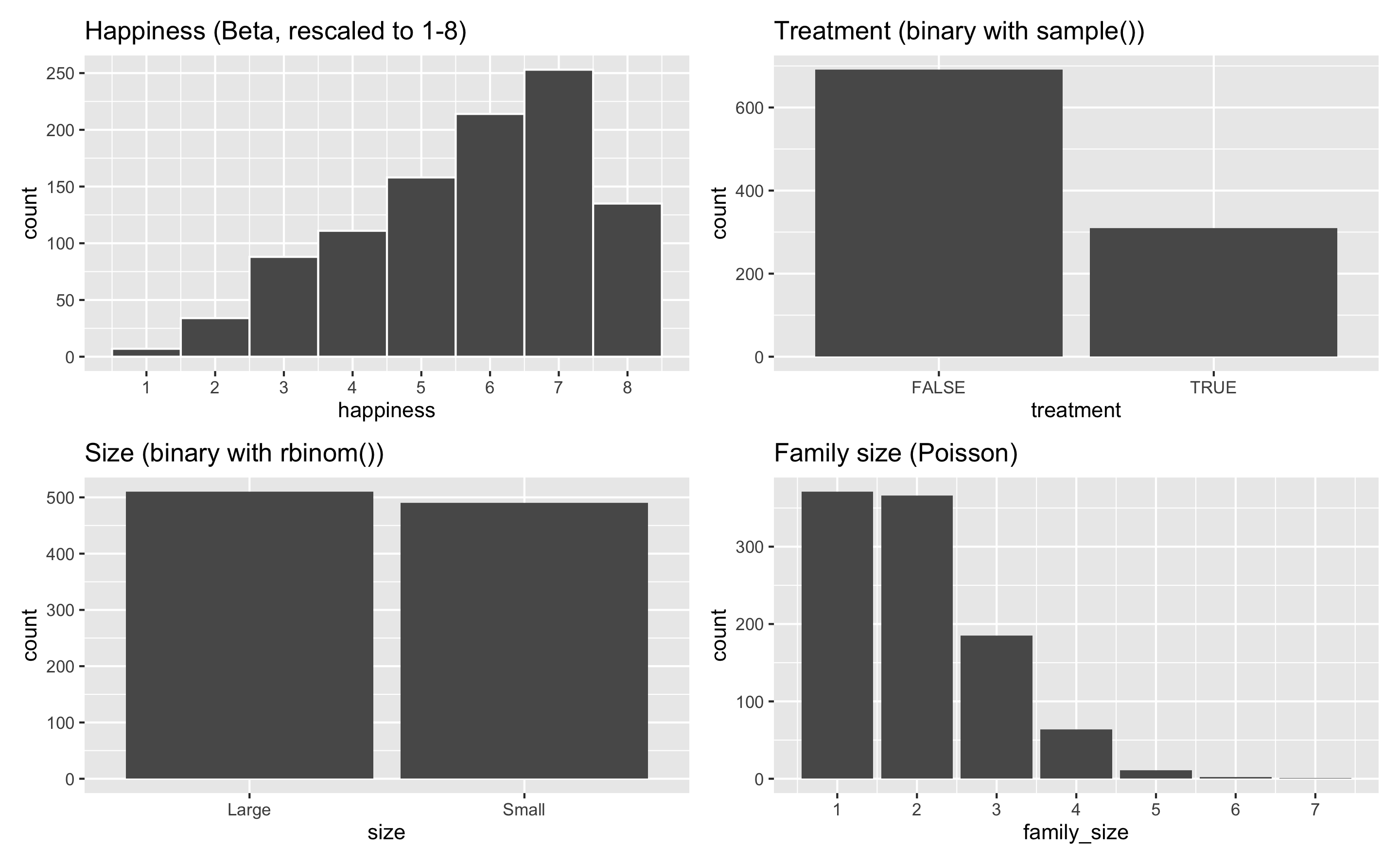 (plot_happiness + plot_treatment) / (plot_size + plot_family)