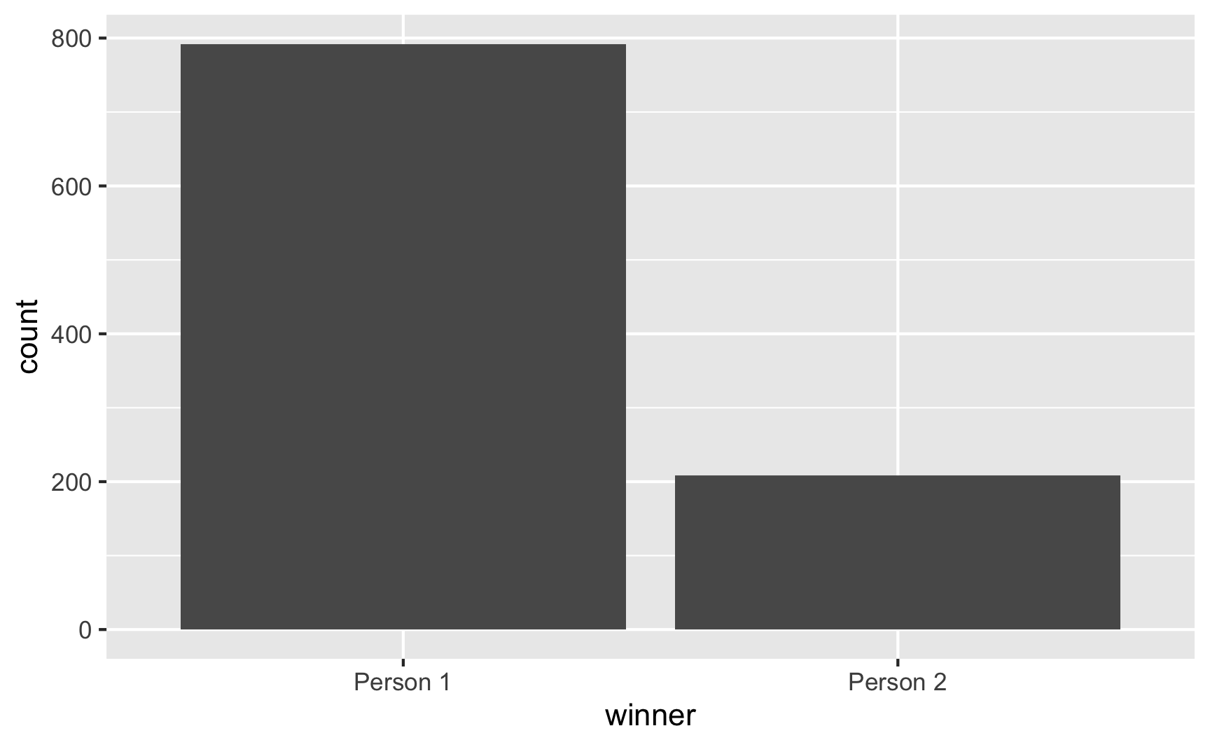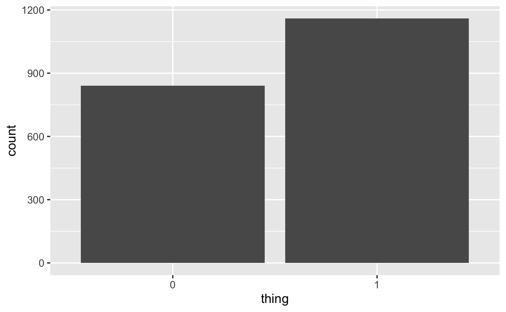 HOWEVER, I don't like using `rbinom()` like this, since this is all group-based, and when you're generating fake people you generally want to use individuals, or groups of 1. So instead, I assume that `size = 1`, which means that each "group" is only one person large. This forces the generated numbers to either be 0 or 1: