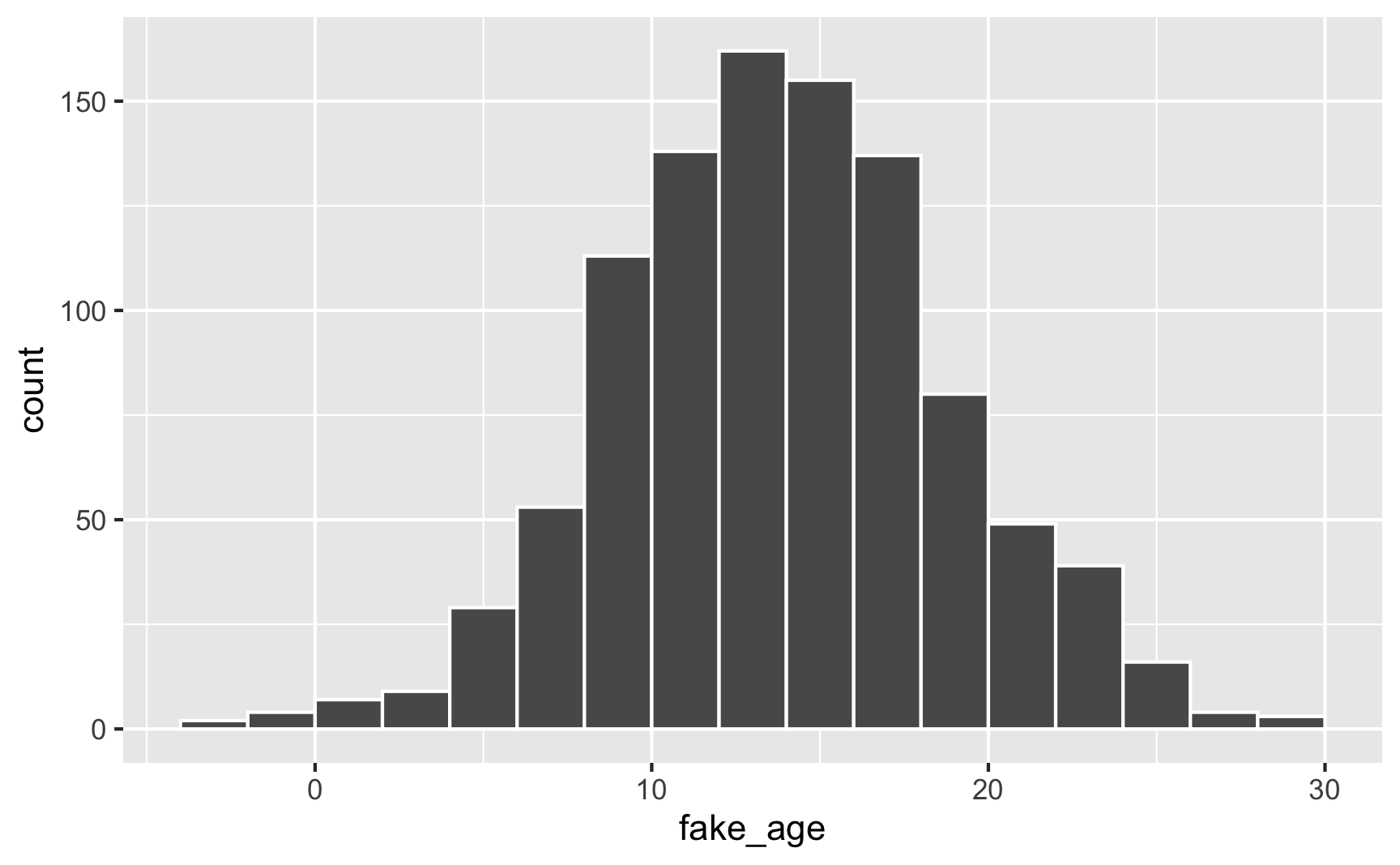 plot_data <- tibble(fake_age = rtruncnorm(1000, mean = 14, sd = 5, a = 12, b = 21))