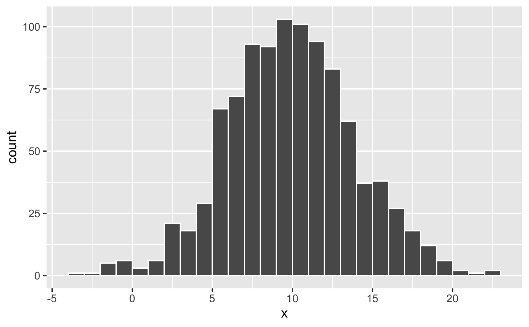 When working with uniform distributions, it’s easy to know how high or low your random values might go, since you specify a minimum and maximum number. With a normal distribution, you don’t specify starting and ending points—you specify a middle and a spread, so it’s harder to guess the whole range. Plotting random values is thus essential. Here’s 1,000 random numbers clustered around 10 with a standard deviation of 4: