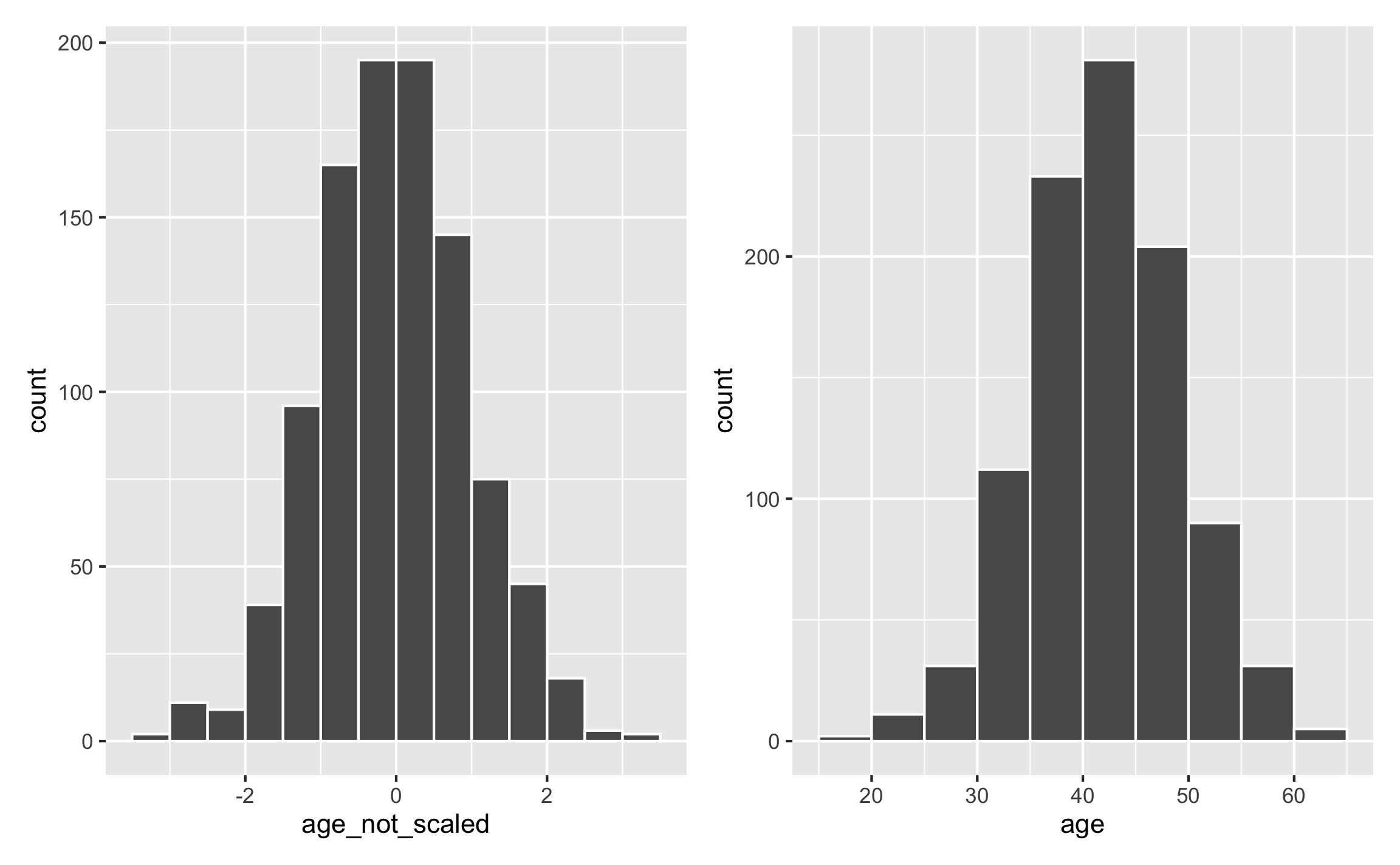 Rescaling things is really helpful when building in effects and interacting columns with other columns, since multiplying variables by different coefficients can make the values go way out of the normal range. You'll see a lot more of that in the [synthetic data example](/example/synthetic-data.qmd).