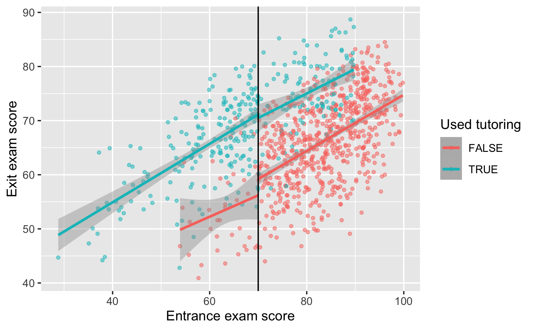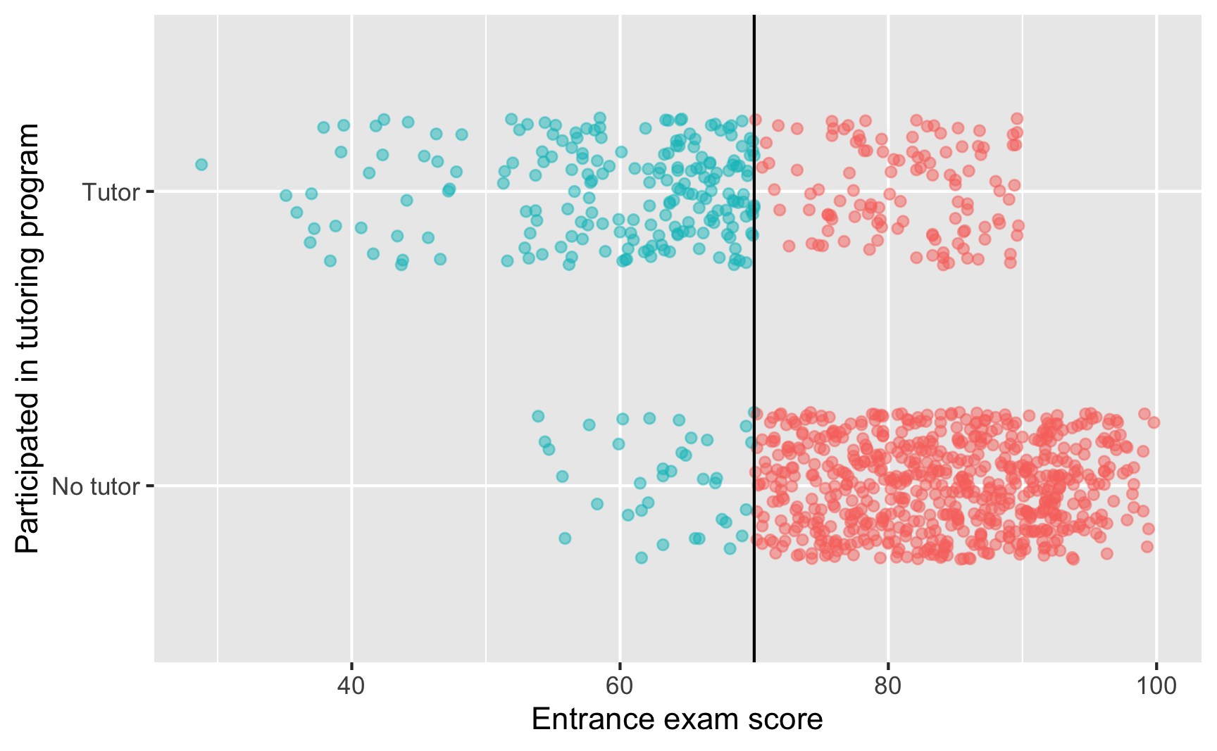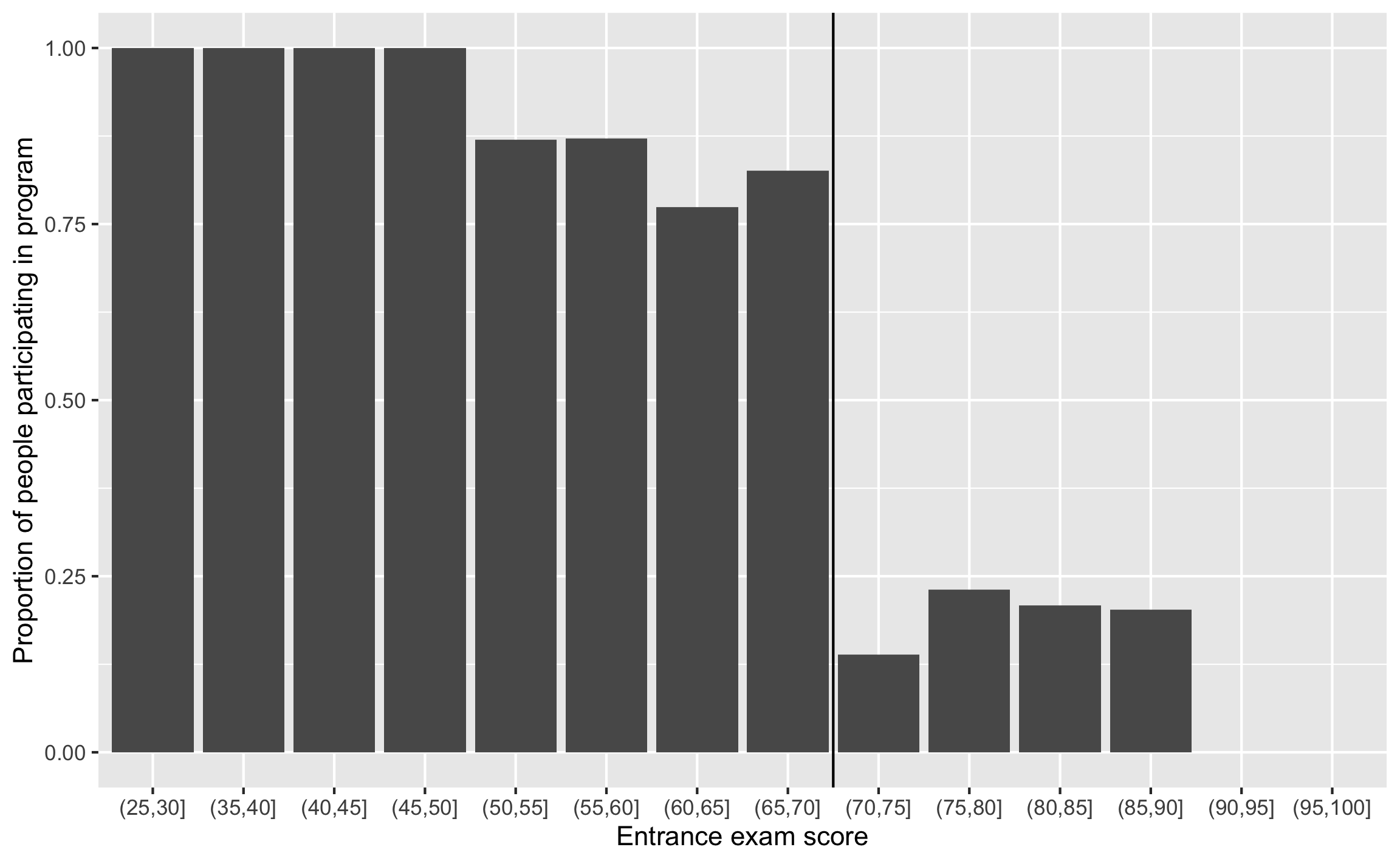 Another way to look at this is to make a sort of histogram that shows the probability of being in the tutoring program at different entrance exam scores. 100% of people who score between 25 and 50 on the exam used tutoring, so that’s good, but then the probability of tutoring drops to ≈80ish% up until the cutpoint at 70. After 70, there’s a 10–15% chance of using tutoring if you’re above the threshold.