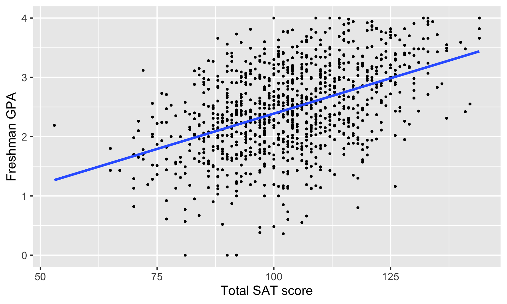 labs(x = "Total SAT score", y = "Freshman GPA")