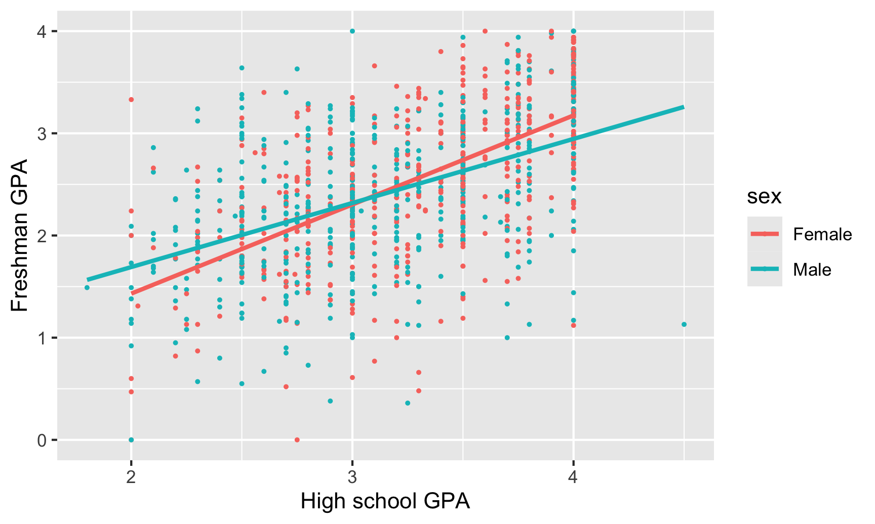 labs(x = "High school GPA", y = "Freshman GPA")