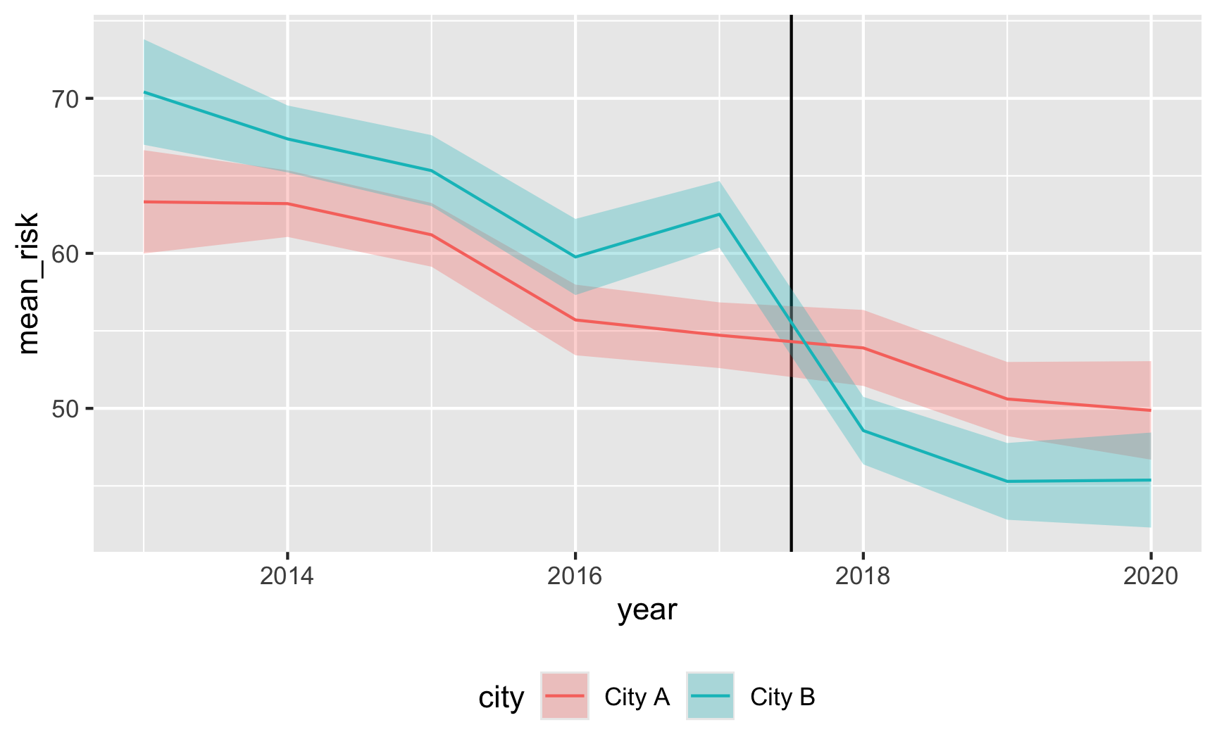 Does risk decrease over time? And are the trends parallel? There was a weird random spike in City B in 2017 for whatever reason, but in general, the trends in the two cities are pretty parallel from 2013 to 2017.
