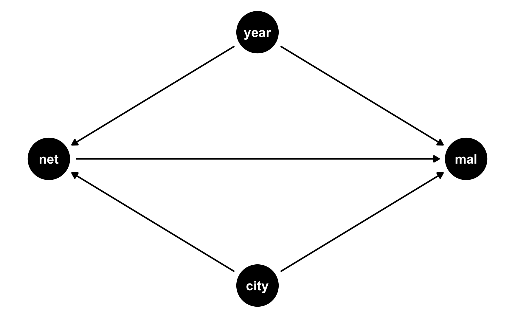 - **`mal ~ net + year + city`**: Malaria risk is determined by net use, year, and city. It's determined by lots of other things too (like we saw in the previous DAGs), but since we're assuming that the two cities are comparable treatment and control groups, we don't need to worry about things like health, income, age, etc.