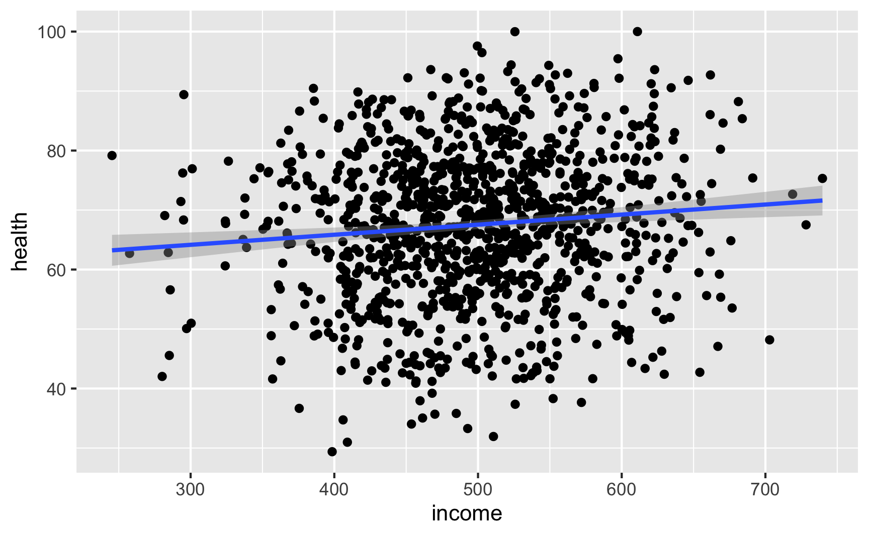 Let’s see if we have the relationships we want. Income looks like it’s associated with health: