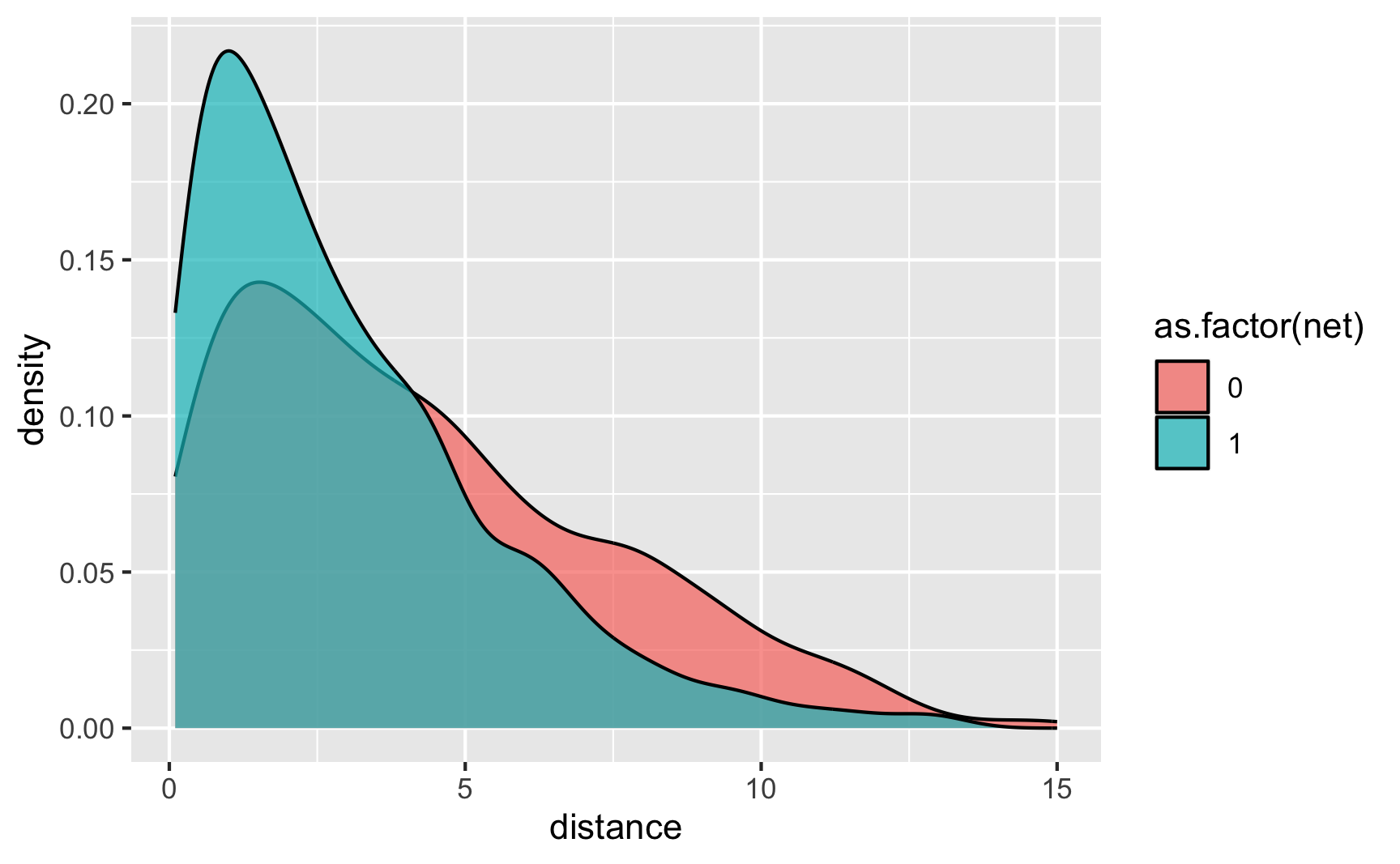 ggplot(iv_data, aes(x = distance, fill = as.factor(net))) +