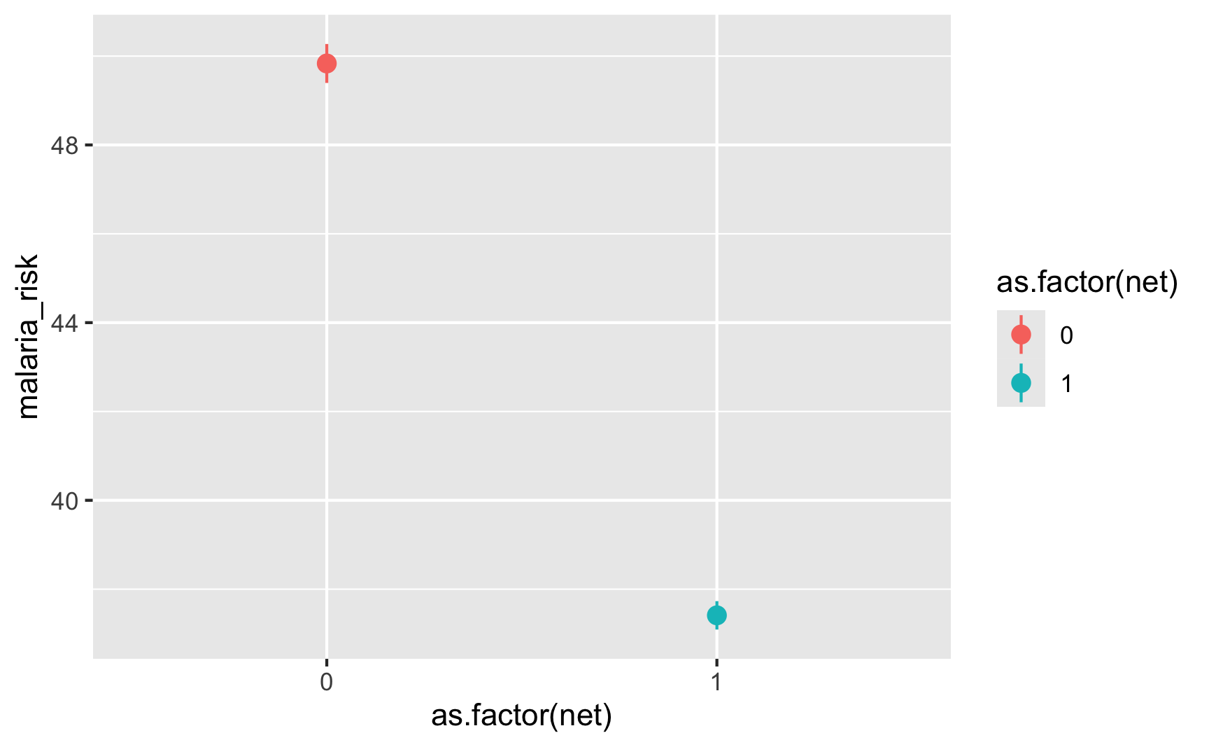Is there a relationship between net use and malaria risk? Haha, yeah, that’s a huge highly significant effect. Probably too perfect. We could increase those error bars if we tinker with some of the numbers in the code, but for the sake of this example, we’ll leave them like this.