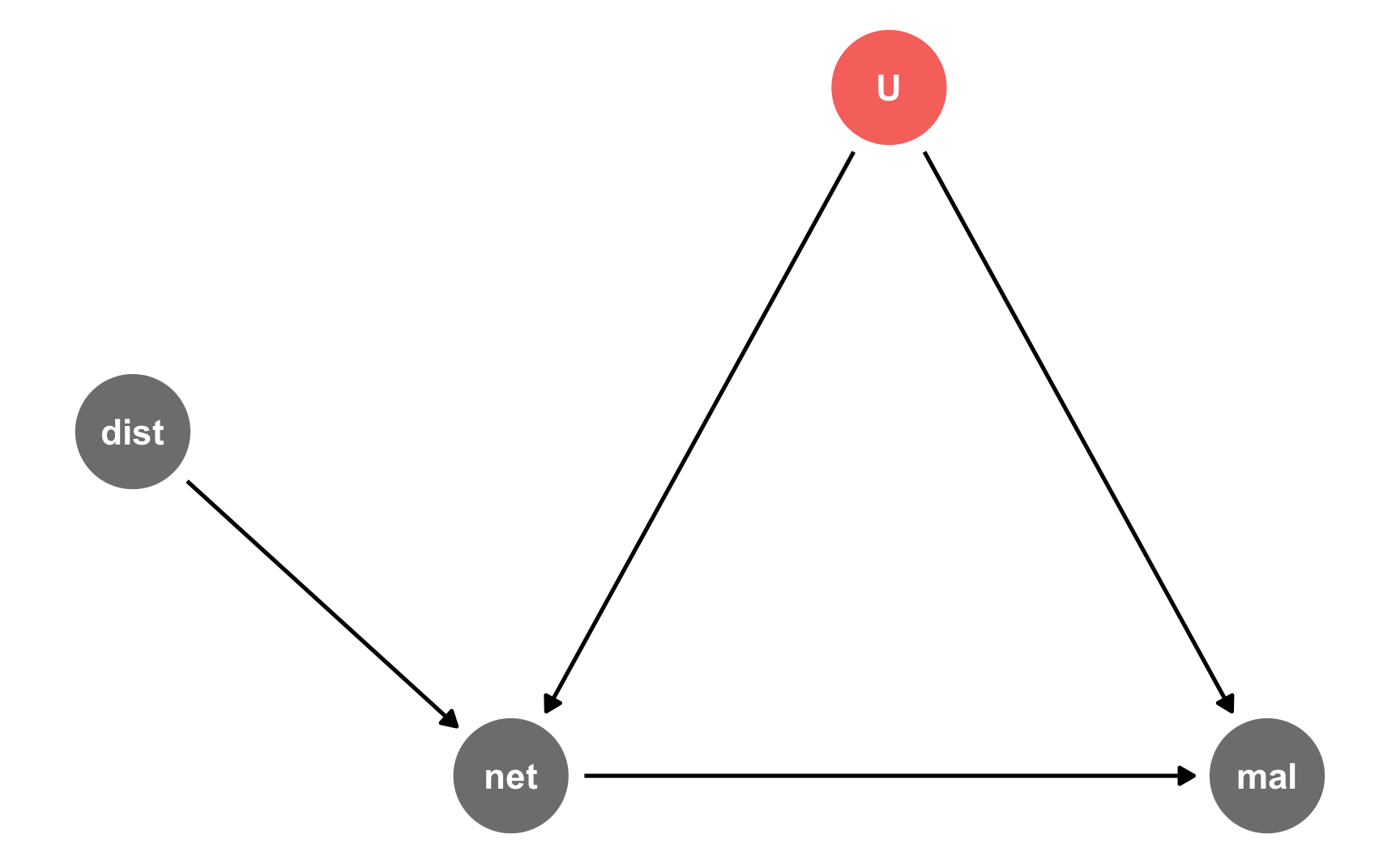 - **`mal ~ net + U`**: Malaria risk is determined by both net usage and unkown stuff, or the magical column we're calling "risk factors." We'll say that a one point increase in risk factors increases malaria risk, and that using a mosquito net causes a decrease of 10 points on average. That's our causal effect.