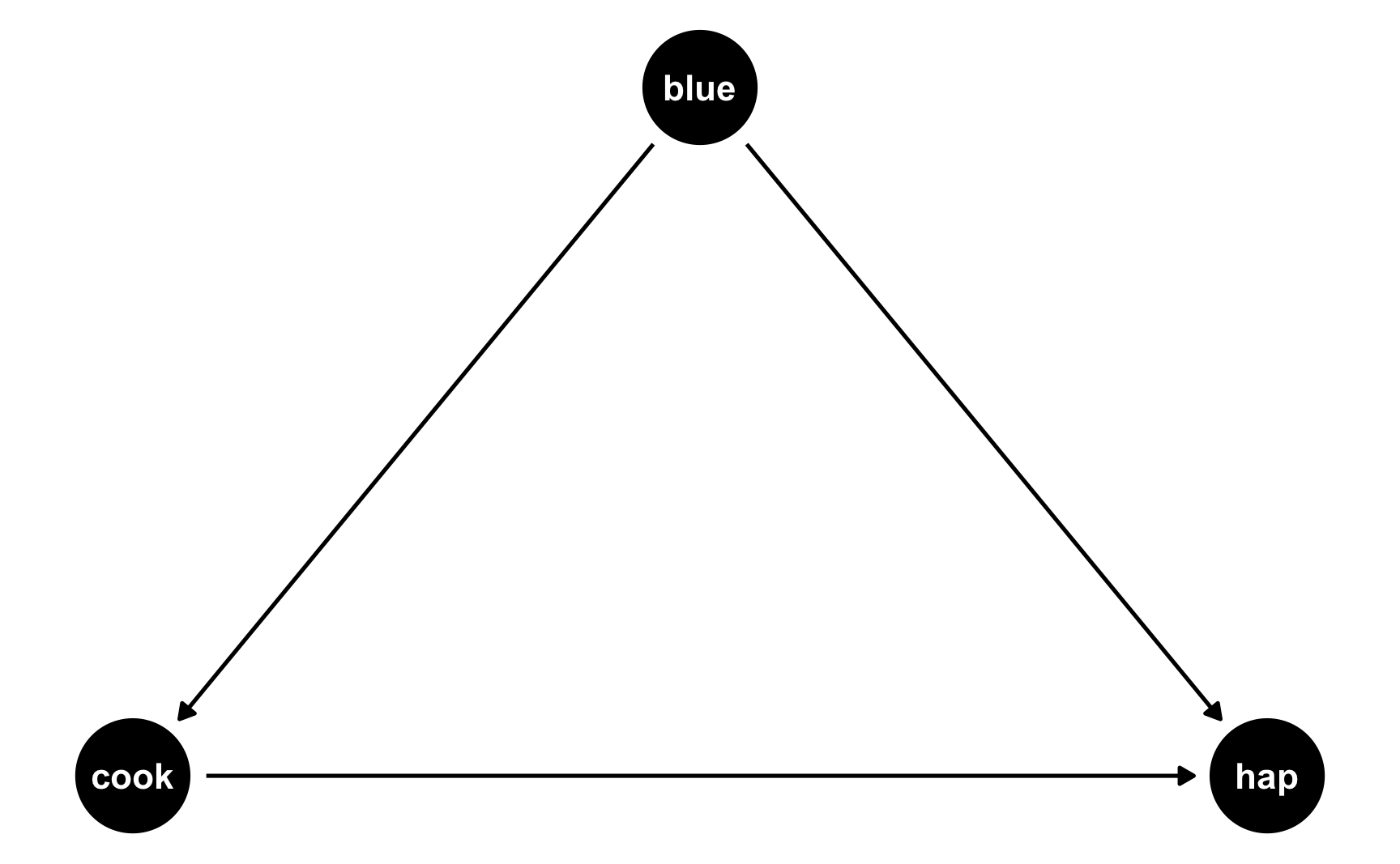 Based on this, eating a cookie causes you to have 0.325 more happiness points. But that's wrong! Liking the color blue is a confounder and opens a path between cookies and happiness. You can see the confounding both in the DAG (since blue points to both the cookie node and the happiness node) and in the math (liking blue boosts happiness + liking blue boosts cookie consumption, which boosts happiness).