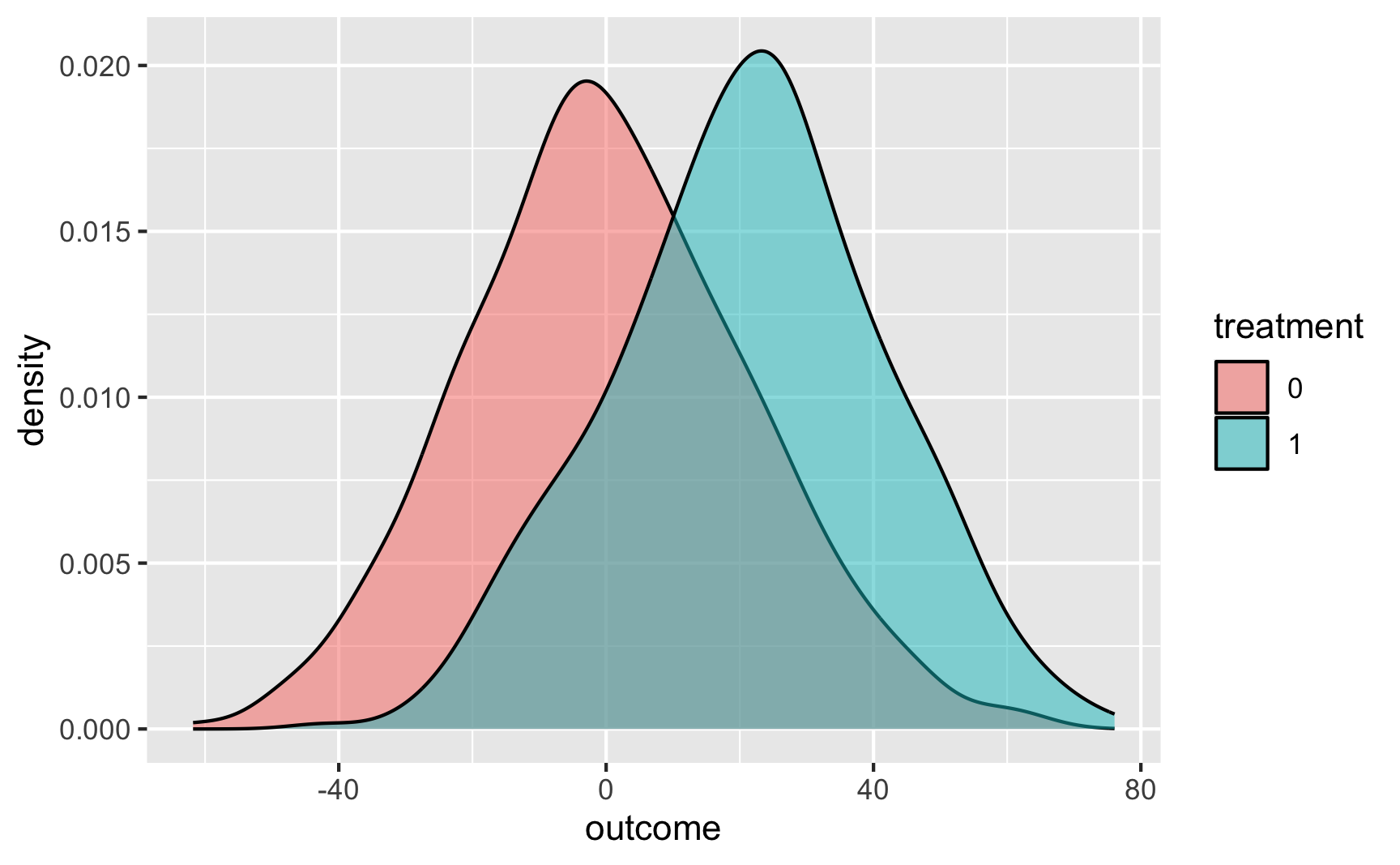 Let's make two columns: a continuous outcome (y) and a binary treatment (x). Being in the treatment group causes an increase of 20 points, on average.