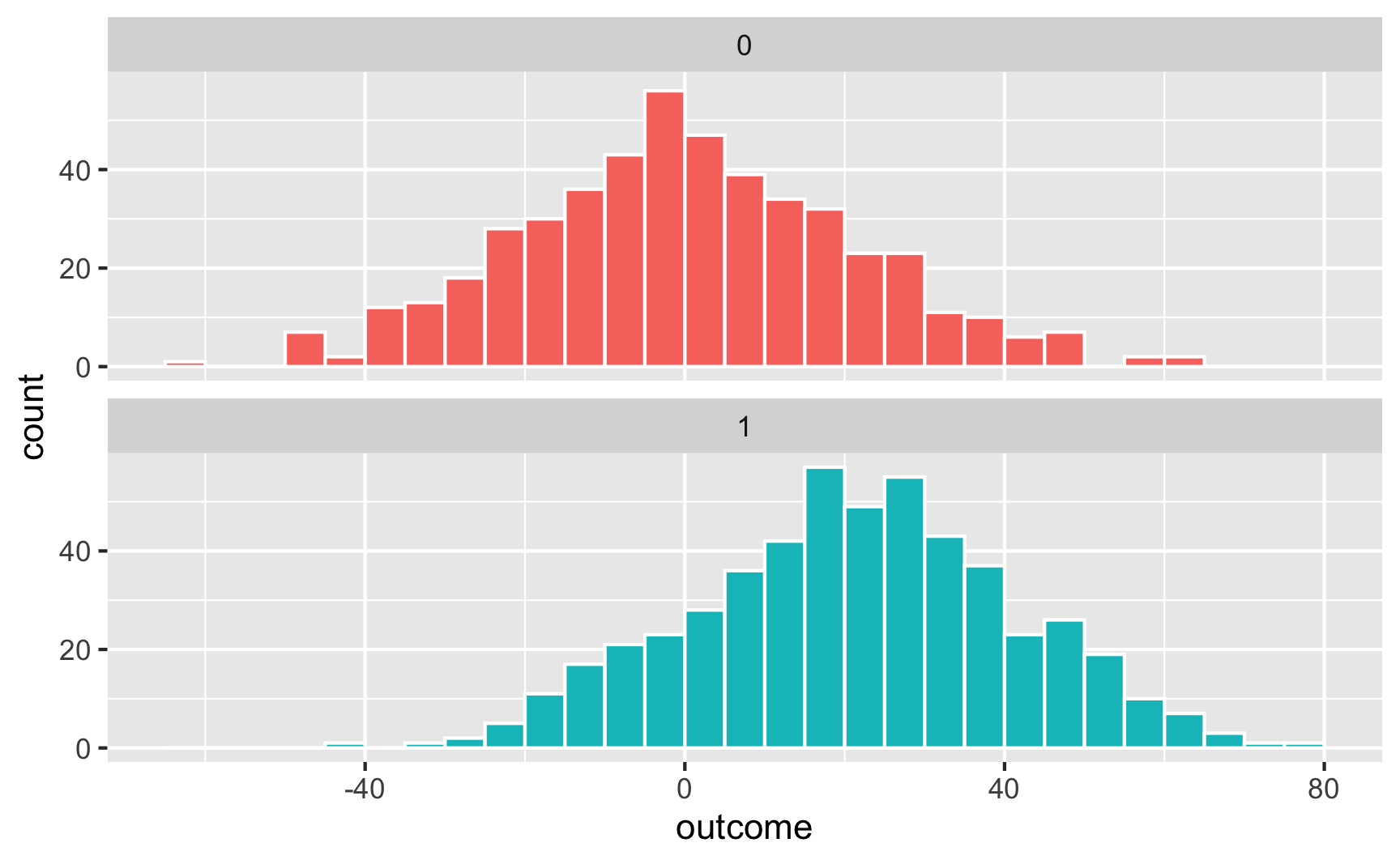 You'll run your data generation chunks lots and lots and lots of times, tinkering with the numbers as you go. This example makes it look easy, since it's the final product, but I ran all these chunks over and over again until I got the causal effect and relationships just right.