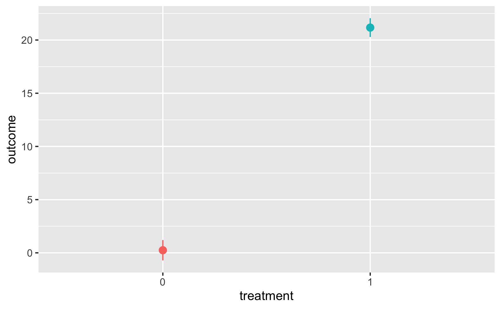 ggplot(temp_data, aes(x = treatment, y = outcome, color = treatment)) +