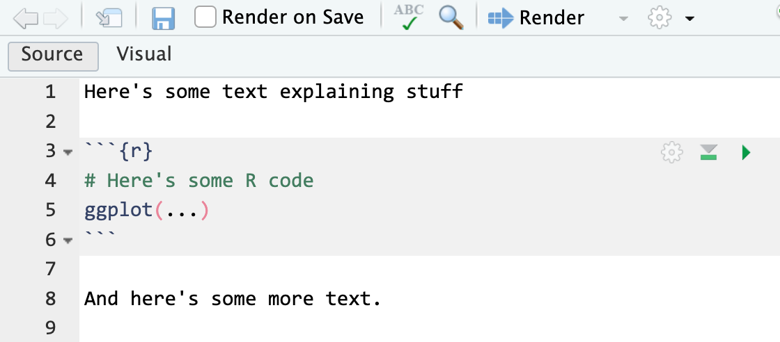If you notice that your document is looking funny, switch to the source editor and make sure the chunk ends with triple backticks: