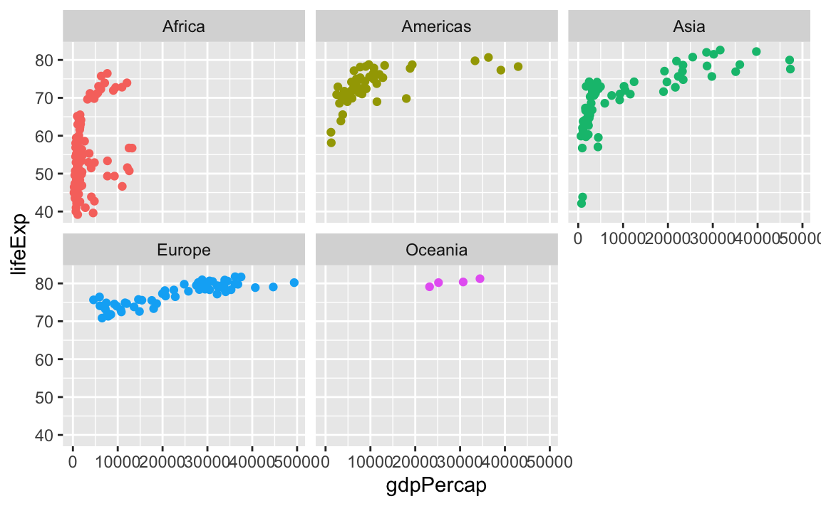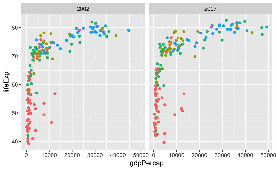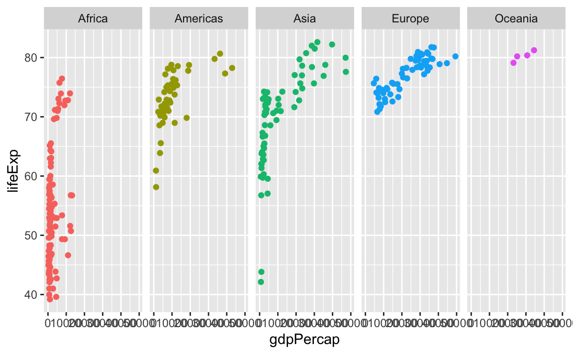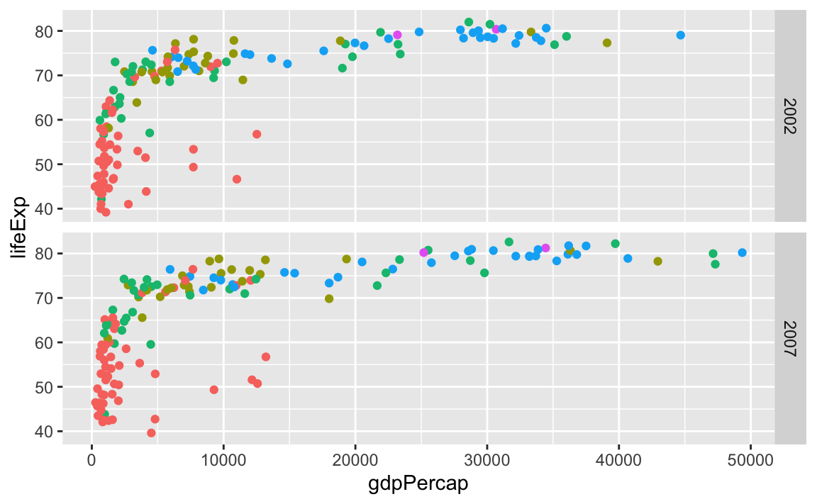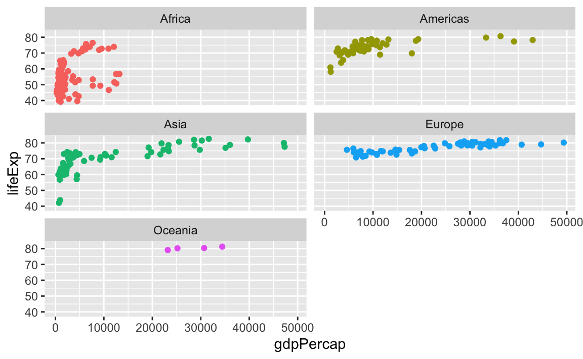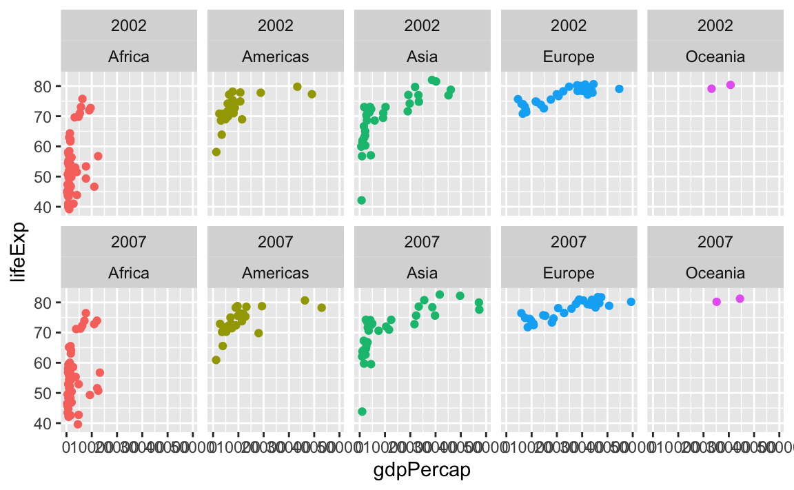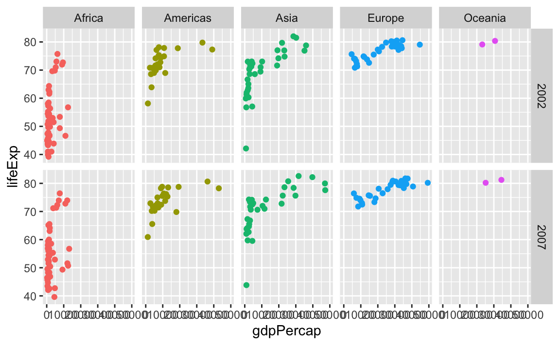 Both functions create facets, but they do it in different ways. facet_grid() creates a grid with a set number of rows and columns, and it puts the labels of those rows and columns in the strips along the facets. Here’s a little example with data from gapminder.