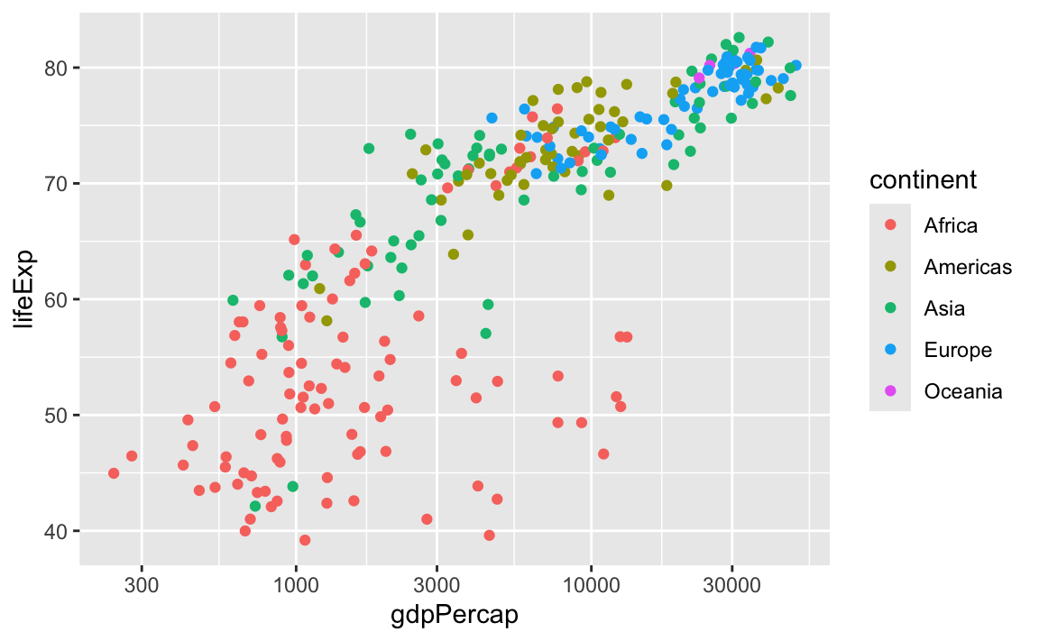 ggplot(gapminder_small, aes(x = gdpPercap, y = lifeExp, color = continent)) +