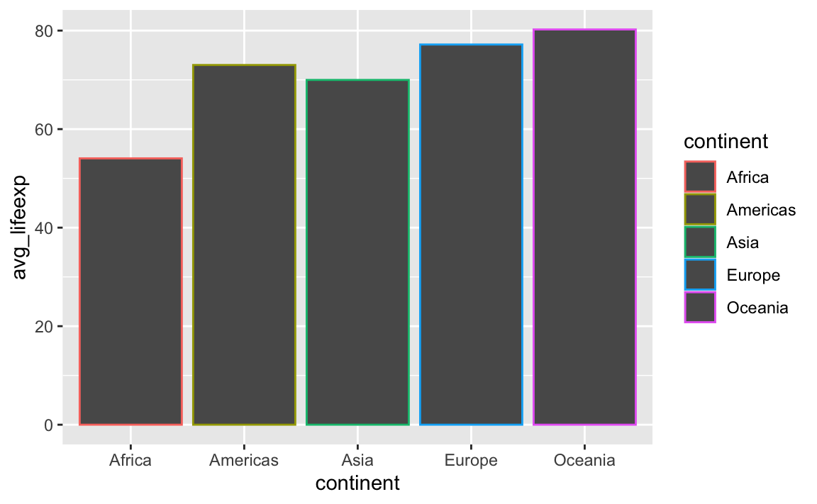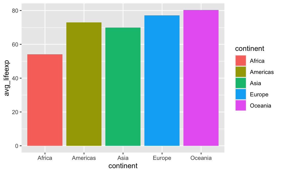 aes(x = continent, y = avg_lifeexp, fill = continent)