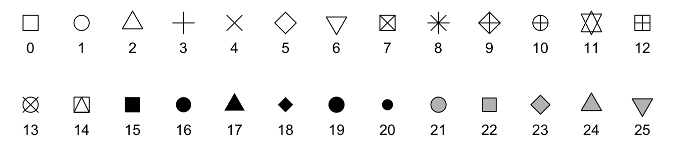 R and ggplot have 26 possible shapes that you can use, and they’re numbered 0–25. You can see what they are in the documentation if you run ?pch in the console, which (maybe??) stands for “point character” (I think??):