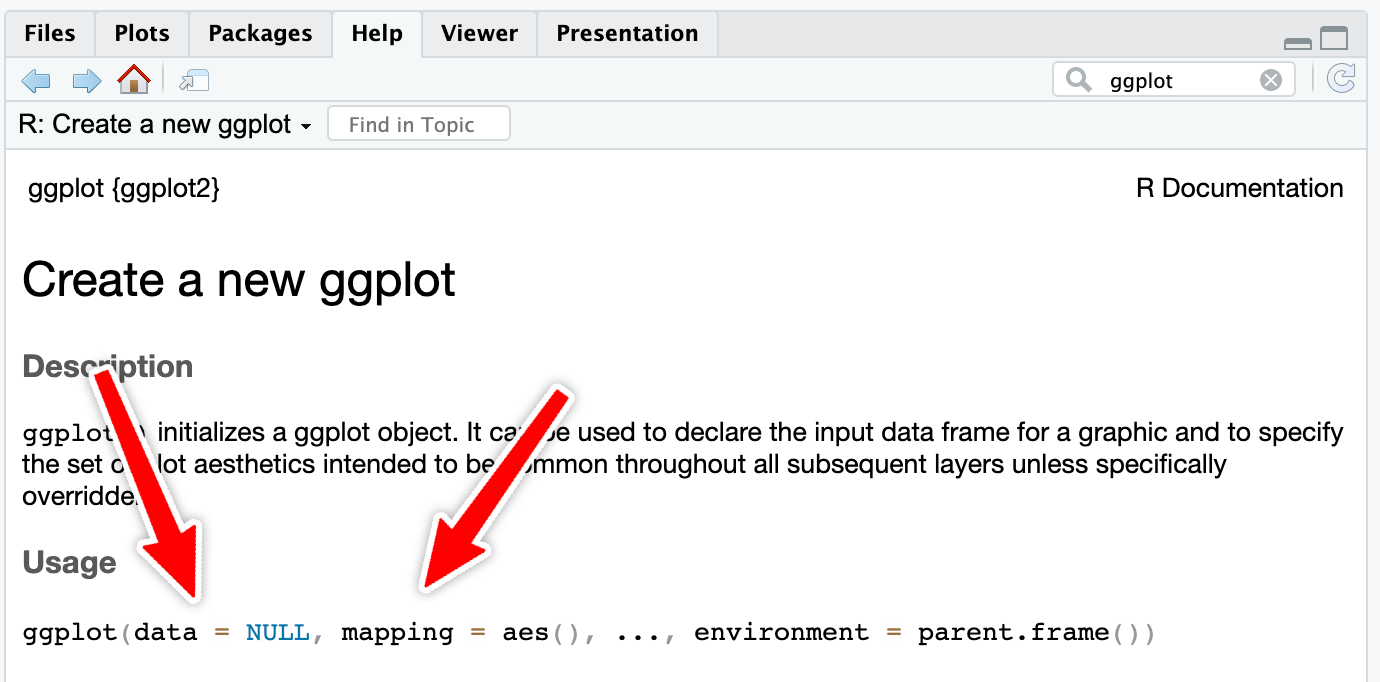 However, with really common functions like ggplot(), you can actually skip the names. If you look at the documentation for ggplot() (i.e. run ?ggplot in your R console or search for “ggplot” in the Help panel in RStudio), you’ll see that the first expected argument is data and the second is mapping.