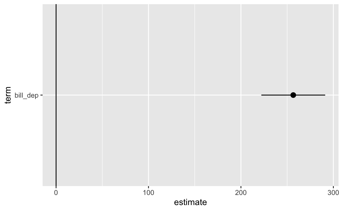 Because tidy() returns a data frame, you can do all the regular dplyr stuff to it, like filtering, mutating, selecting, grouping, summarizing, and so on. Like, here’s just the coefficient for bill depth, without the statistic column: