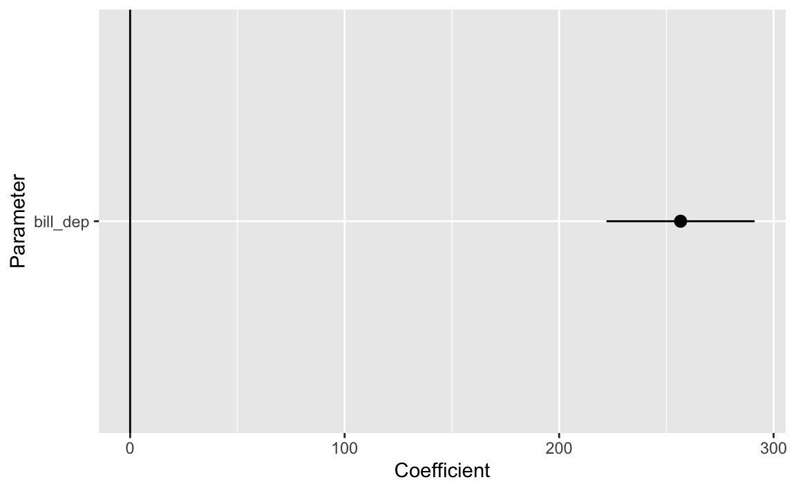 model_parameters(model_interaction)## Parameter | Coefficient | SE | 95% CI | t(336) | p## ---------------------------------------------------------------------------------------------## (Intercept) | -283.28 | 437.94 | [-1144.73, 578.17] | -0.65 | 0.518 ## bill dep | 217.15 | 23.82 | [ 170.30, 264.00] | 9.12 | < .001## species [Chinstrap] | 247.06 | 829.77 | [-1385.14, 1879.26] | 0.30 | 0.766 ## species [Gentoo] | -175.71 | 658.43 | [-1470.88, 1119.47] | -0.27 | 0.790 ## bill dep × species [Chinstrap] | -12.53 | 45.01 | [ -101.06, 76.01] | -0.28 | 0.781 ## bill dep × species [Gentoo] | 152.29 | 40.49 | [ 72.64, 231.94] | 3.76 | < .001## ## Uncertainty intervals (equal-tailed) and p-values (two-tailed) computed using a Wald t-distribution approximation.