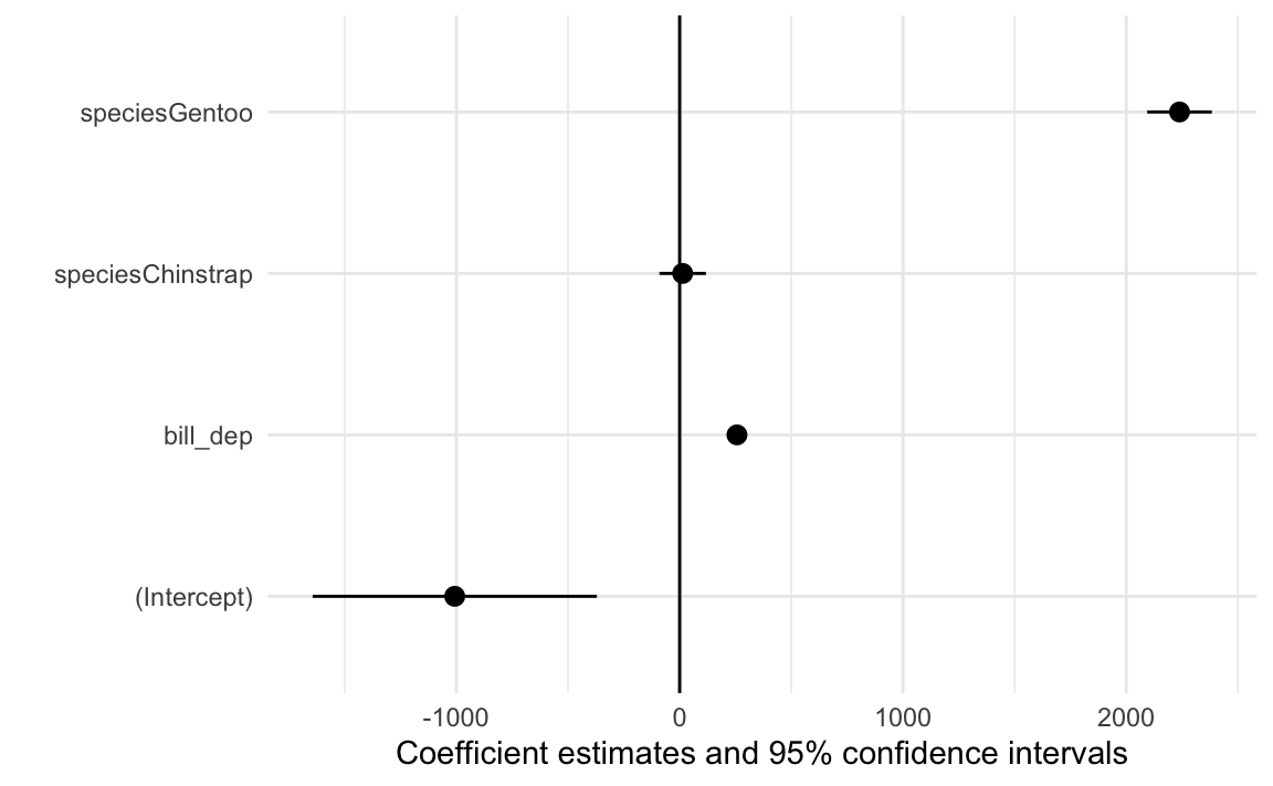 summary(some_model)## ## Call:## lm(formula = body_mass ~ bill_dep + species, data = penguins)## ## Residuals:## Min 1Q Median 3Q Max ## -867.73 -255.61 -27.41 242.41 1190.86 ## ## Coefficients:## Estimate Std. Error t value Pr(>|t|) ## (Intercept) -1007.28 323.56 -3.113 0.00201 ** ## bill_dep 256.61 17.56 14.611 < 2e-16 ***## speciesChinstrap 13.38 52.95 0.253 0.80069 ## speciesGentoo 2238.67 73.68 30.383 < 2e-16 ***## ---## Signif. codes: 0 '***' 0.001 '**' 0.01 '*' 0.05 '.' 0.1 ' ' 1## ## Residual standard error: 362.4 on 338 degrees of freedom## (2 observations deleted due to missingness)## Multiple R-squared: 0.7975, Adjusted R-squared: 0.7957 ## F-statistic: 443.8 on 3 and 338 DF, p-value: < 2.2e-16