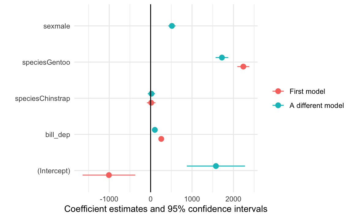 another_model <-lm(body_mass ~ bill_dep + species + sex, data = penguins)modelplot(list("First model"= some_model, "A different model"= another_model)) +geom_vline(xintercept =0)