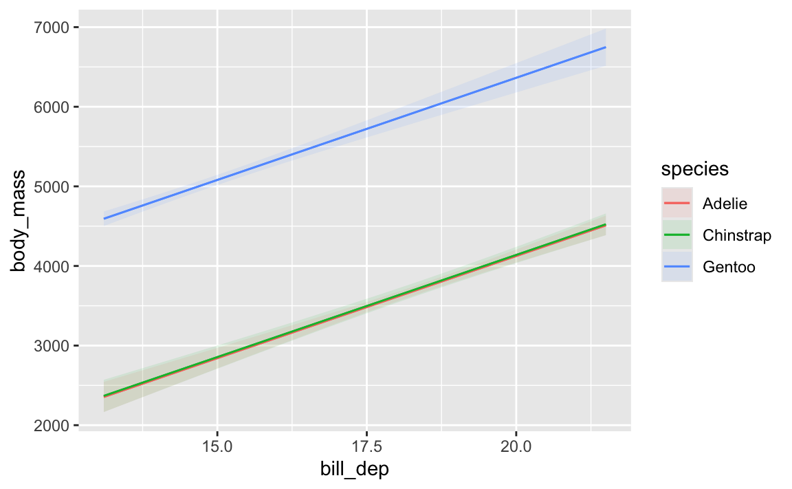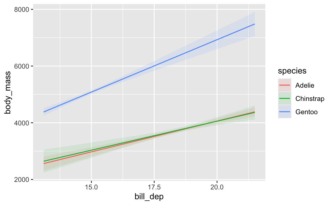 That Gentoo line has a steeper slope than the other two species. We could figure out those slopes by looking at the coefficients and then adding/subtracting the different interaction terms: