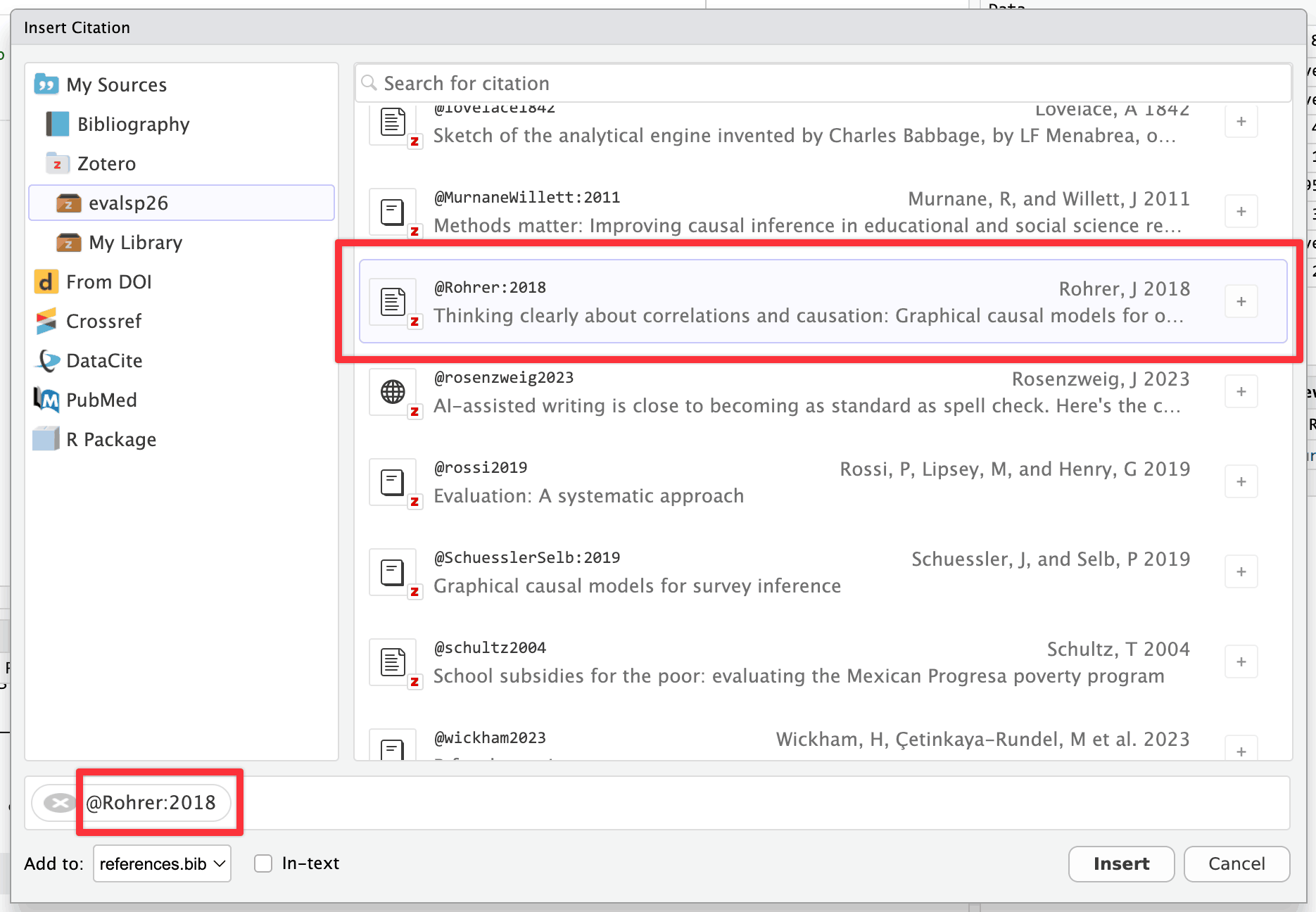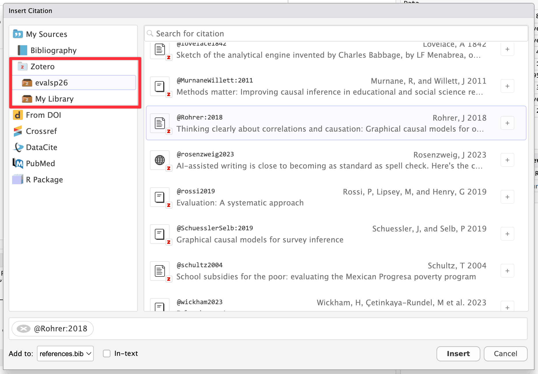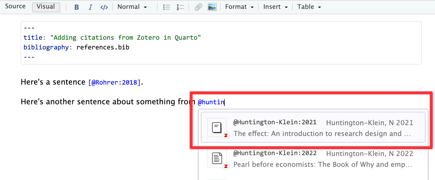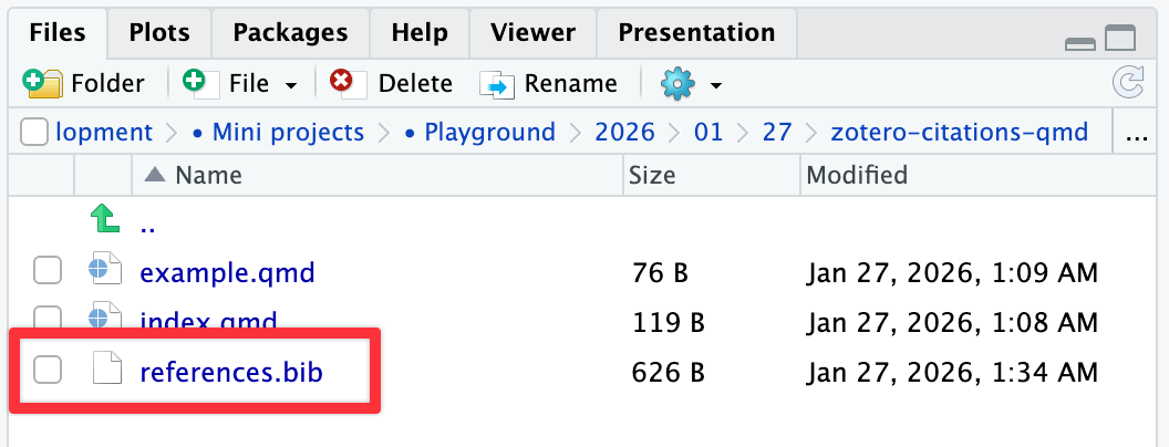You can use these references in your Quarto documents directly in RStudio! You need to set up a few things first, but then it’s straightforward to get automatic citations in your documents. You can also see the official Quarto documentation for citations in general and the RStudio documentation (and this blog post) for working with citations in RStudio.