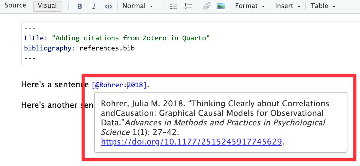 Once the citation key is inserted, you can hover over it in your .qmd file and see a preview of it: