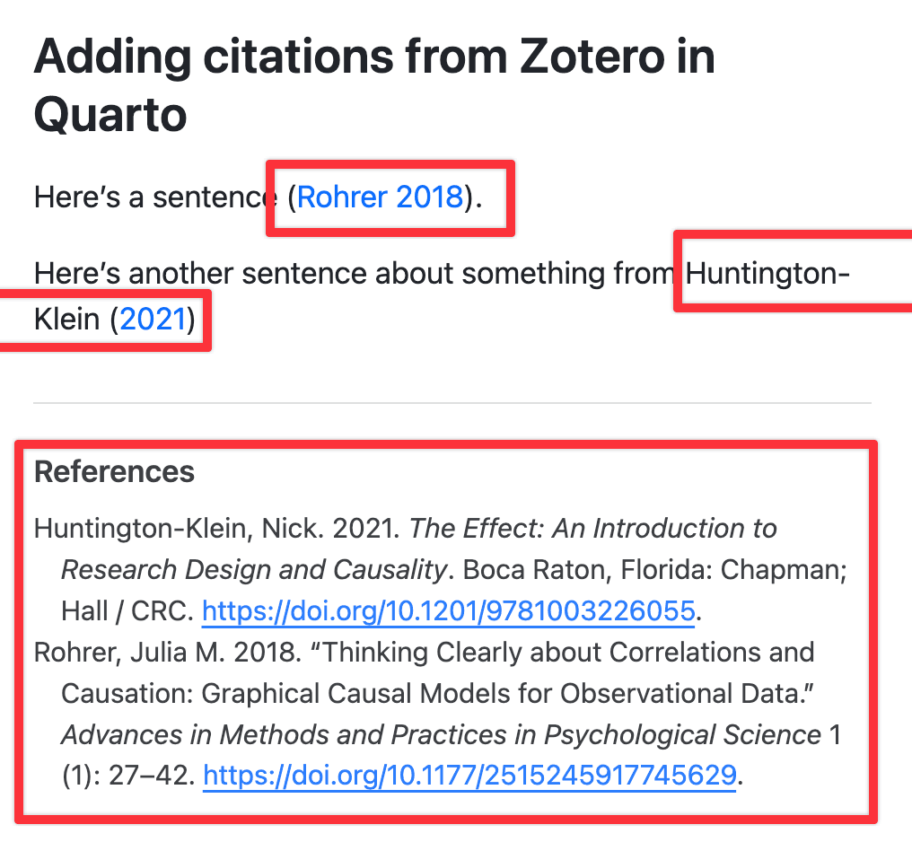 More importantly, when you render the document to HTML, PDF, Word, or whatever format you’re using, you’ll have the correct citation and an automatic list of references: