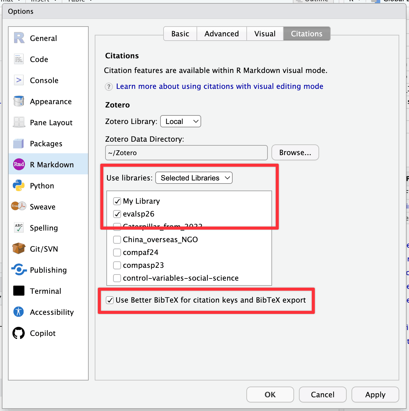 Next, we need to tell RStudio that (1) Zotero exists and that (2) it should look at both your main local library and the shared class group.