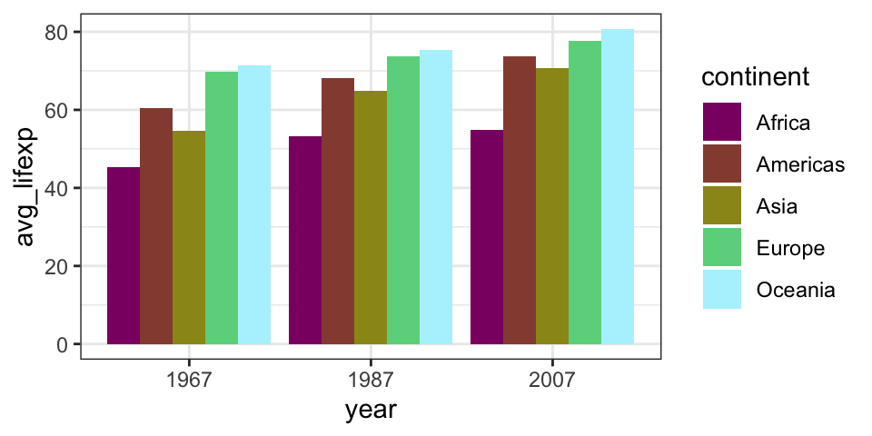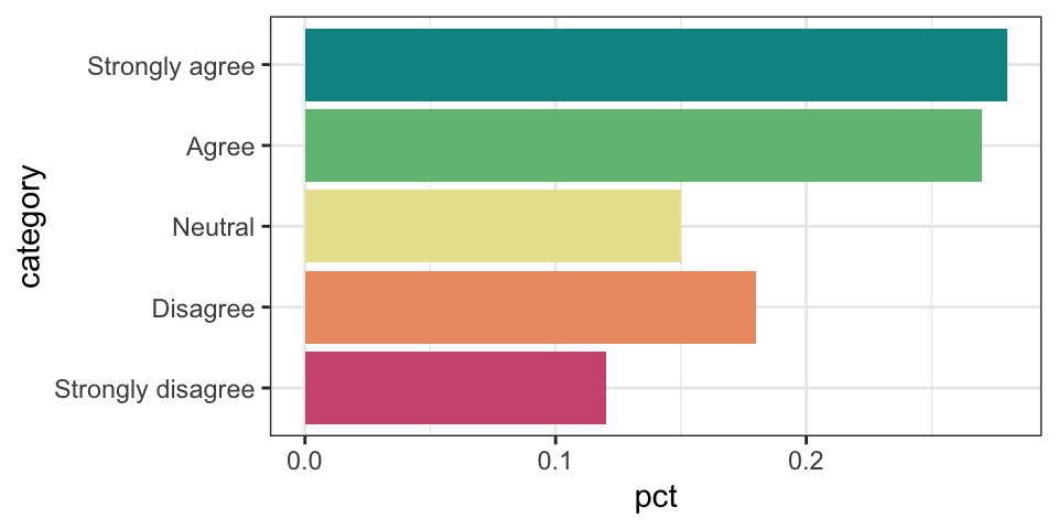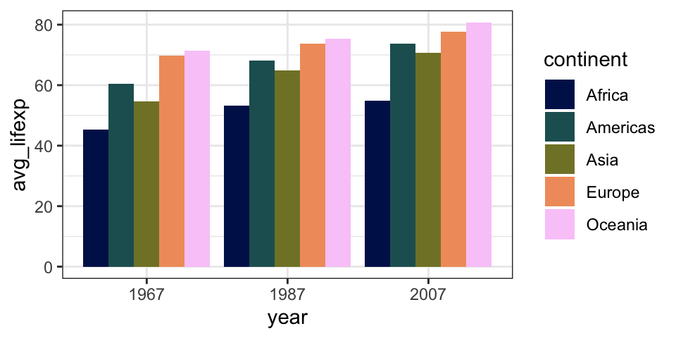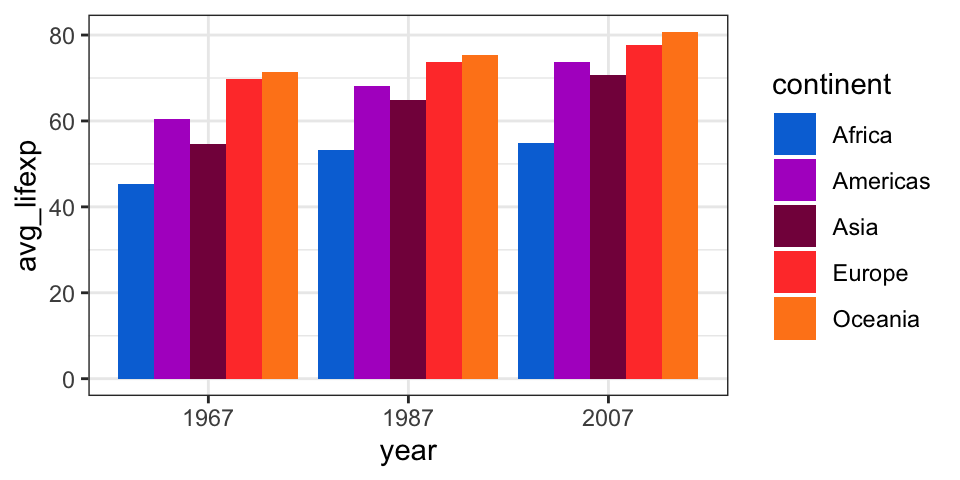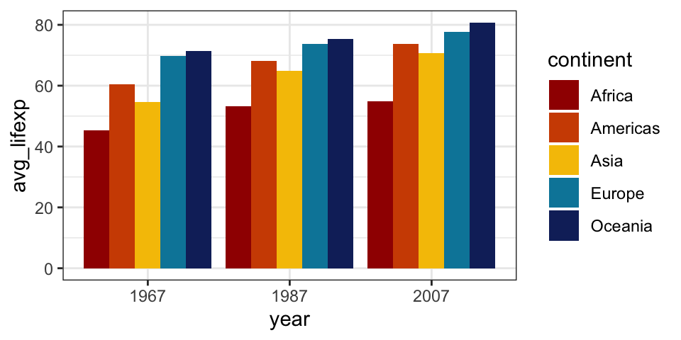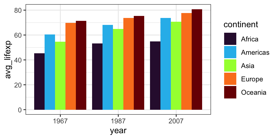 # Extract 5 colors from the Prism palette and use them with scale_fill_manual()clrs <-carto_pal(12, "Prism")plot_qualitative +scale_fill_manual(values = clrs[c(1, 4, 6, 7, 8)])