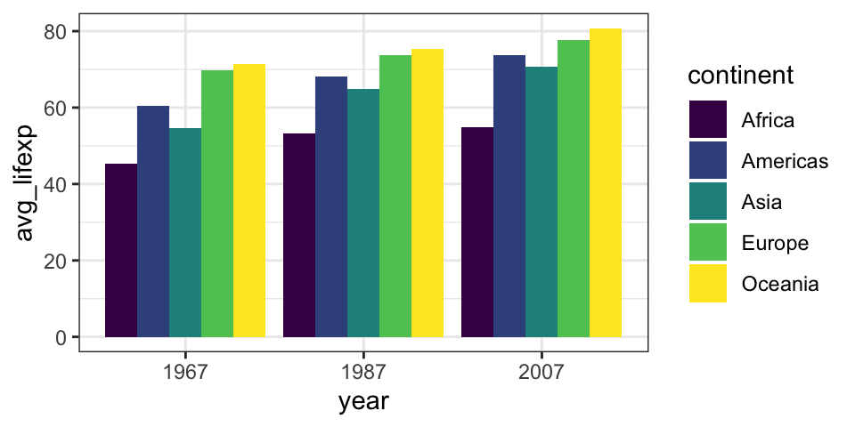 The viridis palettes come with {ggplot2} and you can use them with scale_fill_viridis_d()/scale_color_viridis_d() for discrete data and scale_fill_viridis_c()/scale_color_viridis_c() for continuous data.