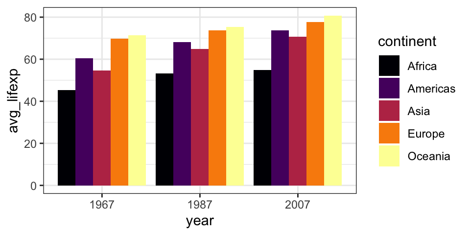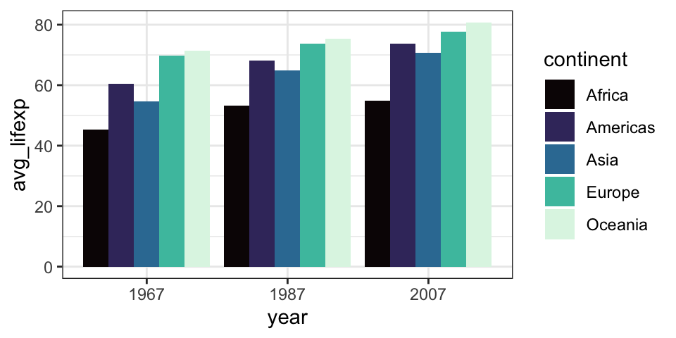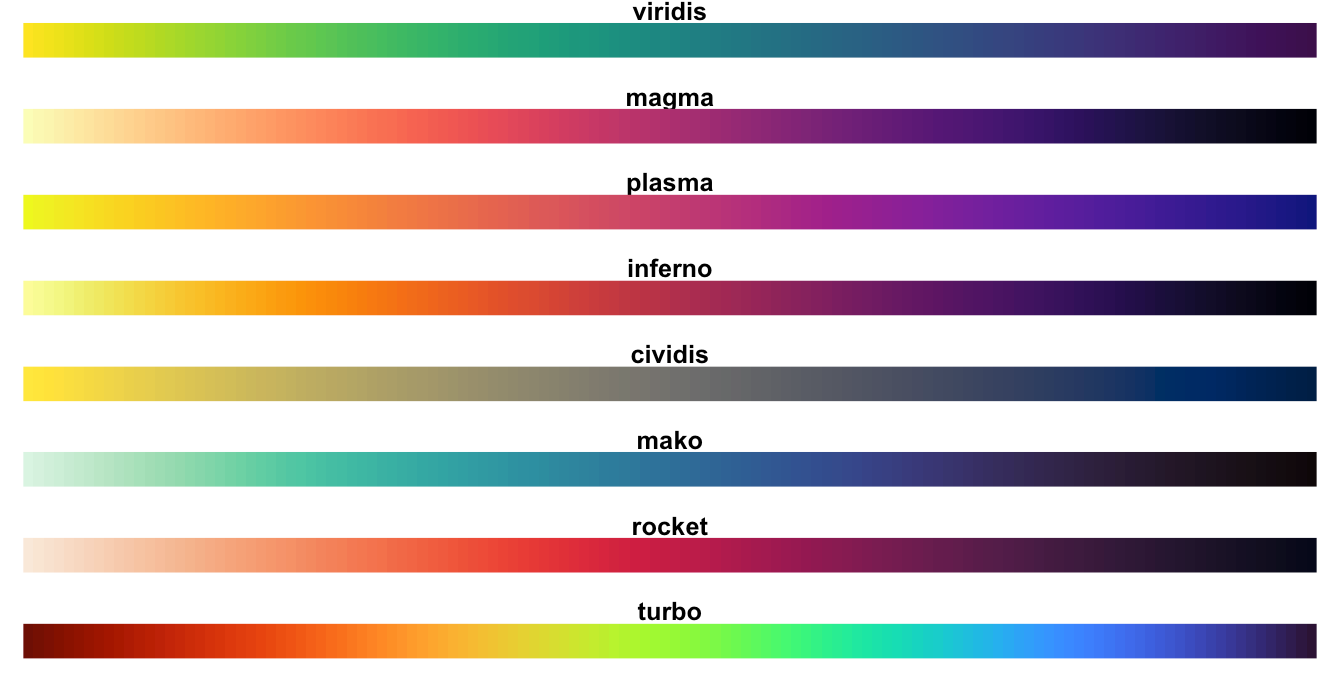 You’ve seen the regular green/blue/yellow viridis palette throughout the class, but there are are a bunch of other palettes within viridis like magma, plasma, inferno, mako, rocket, and turbo.