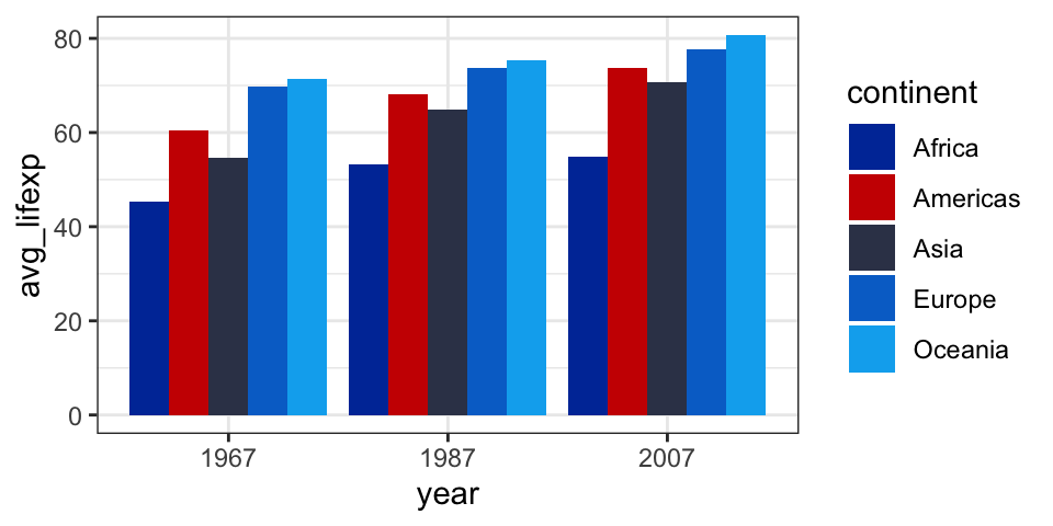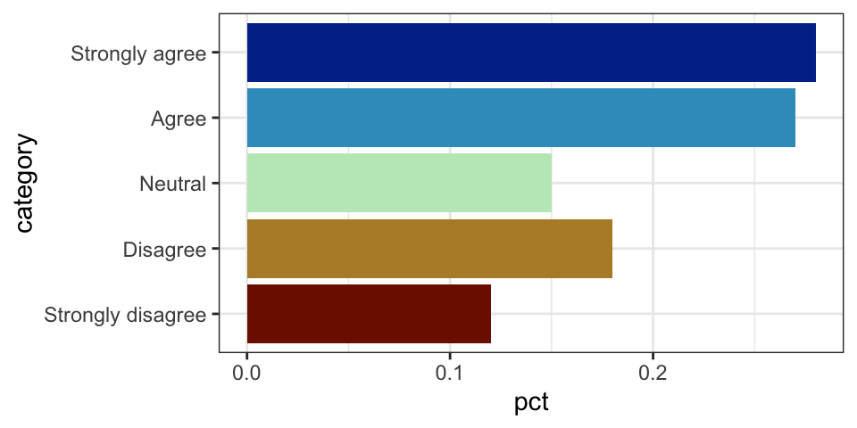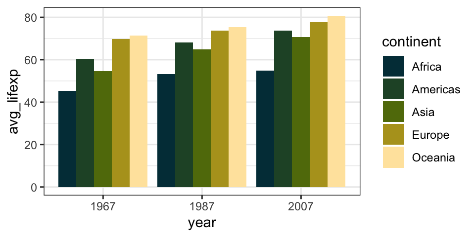 To use one of the palettes, note what it’s called at the website and use that name as the palette argument. The ColorBrewer palettes come with {ggplot2} and you can use them with scale_fill_brewer()/scale_color_brewer() for discrete data and scale_fill_distiller()/scale_color_distiller() for continuous data.