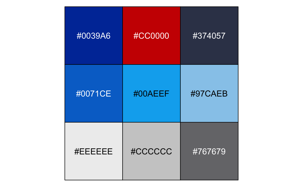 Often organizations have specific color palettes that you’re supposed to use. For instance, GSU has a special “Georgia State Blue” (■#0039A6) and a red accent (■#CC0000). The Urban Institute has a specific organizational color palette with all sorts of guidelines for comparing two groups, three groups, sequential data, diverging data, and other special situations. They have specific red and blue colors to use for political parties too, like ■#1696d2 for Democrats and ■#db2b27 for Republicans.