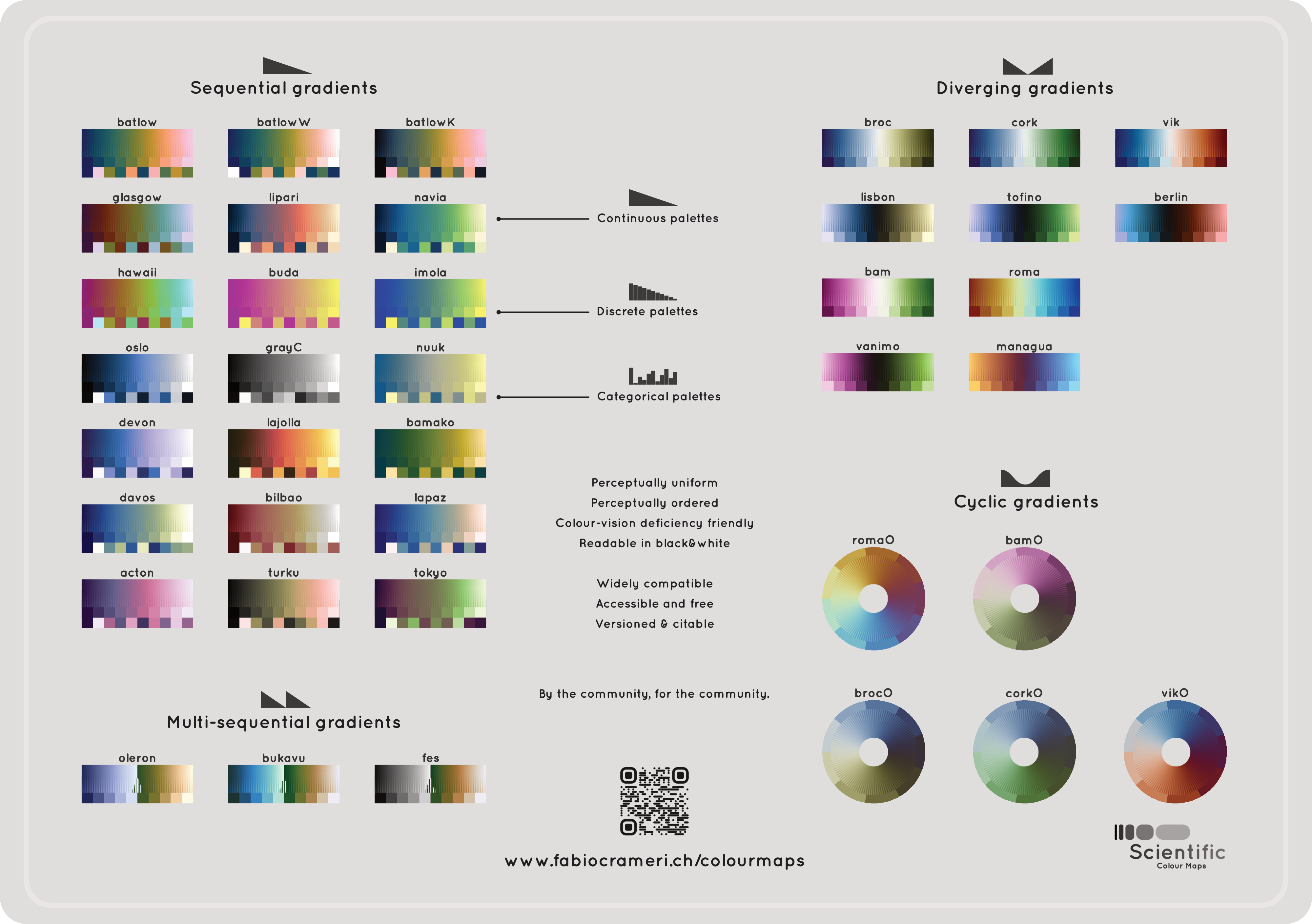 After loading the {scico} package, you can use these palettes with scale_fill_scico_d()/scale_color_scico_d() for discrete data and scale_fill_scico_c()/scale_color_scico_c() for continuous data.